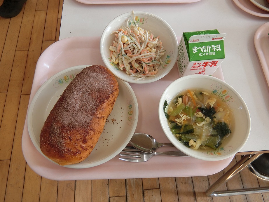 3月4日きな粉揚げパン、牛乳、シーザーサラダ、アルファベットスープ
