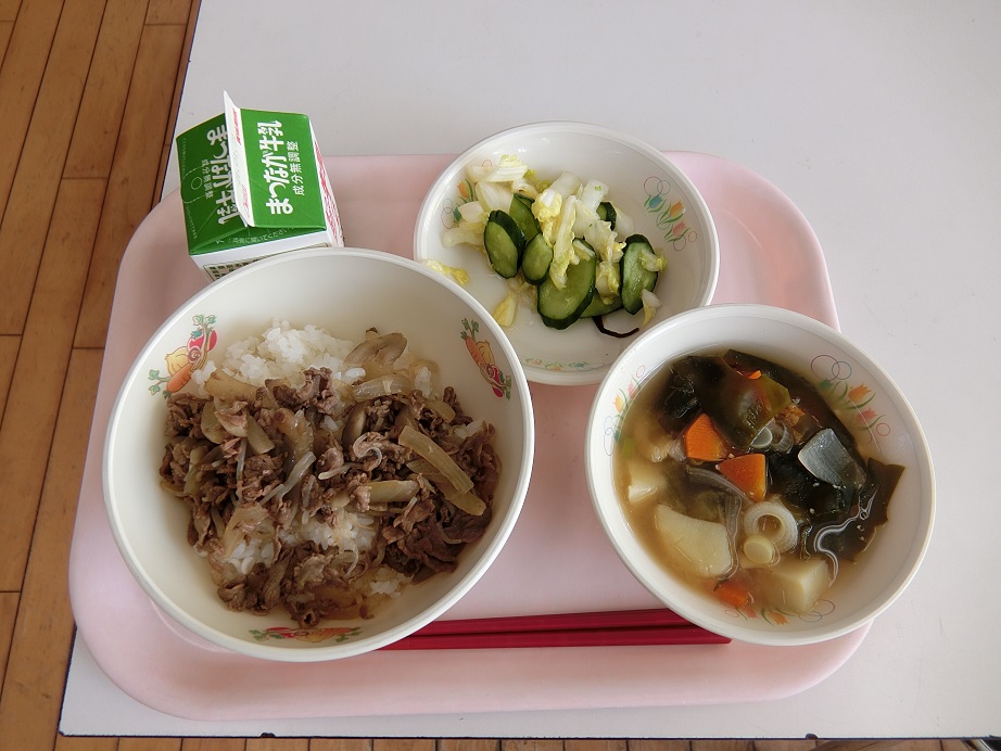 1月15日 県産牛肉学校給食提供事業福島県産牛肉の牛丼、牛乳、即席漬け、大根の味噌汁