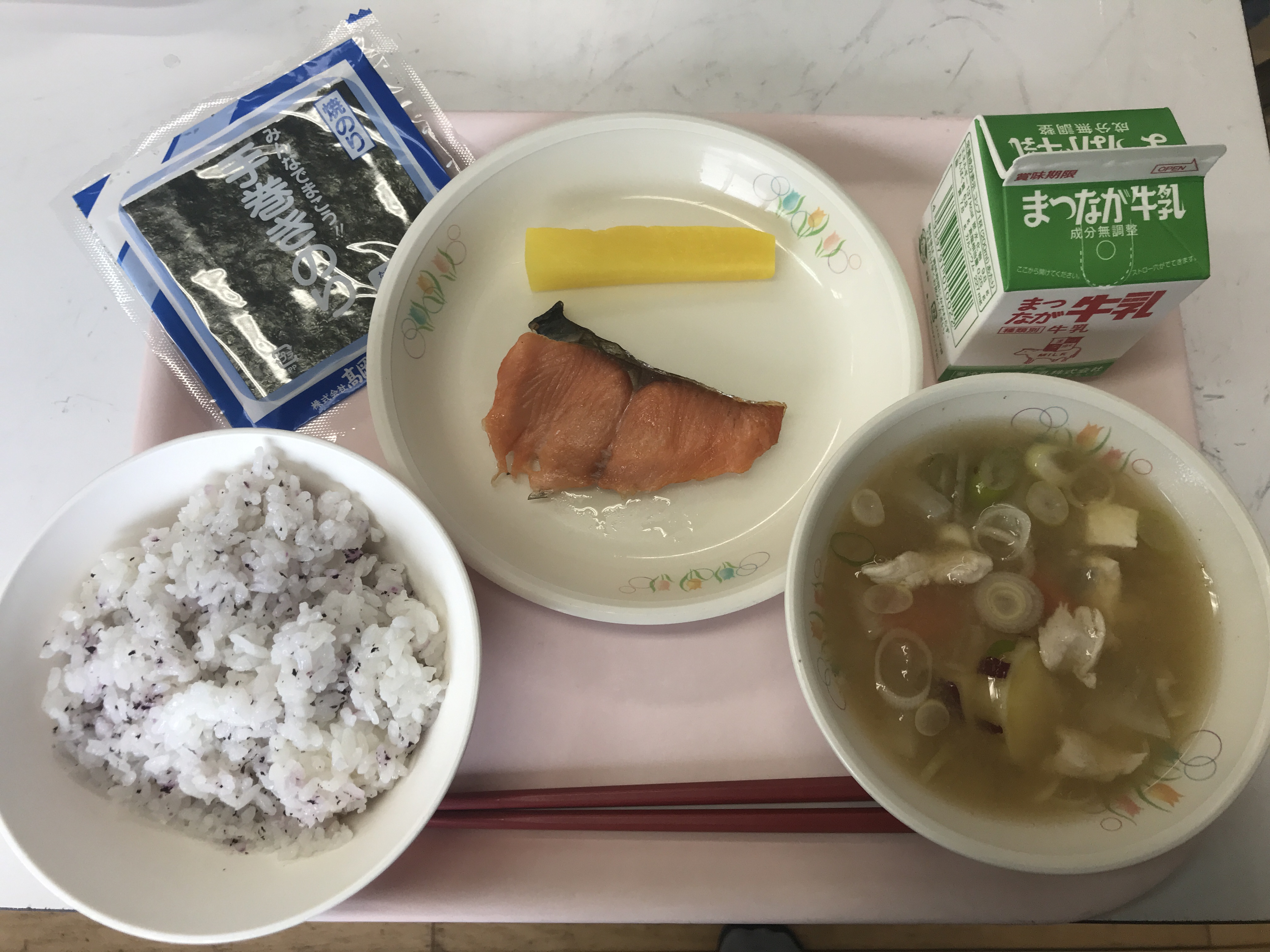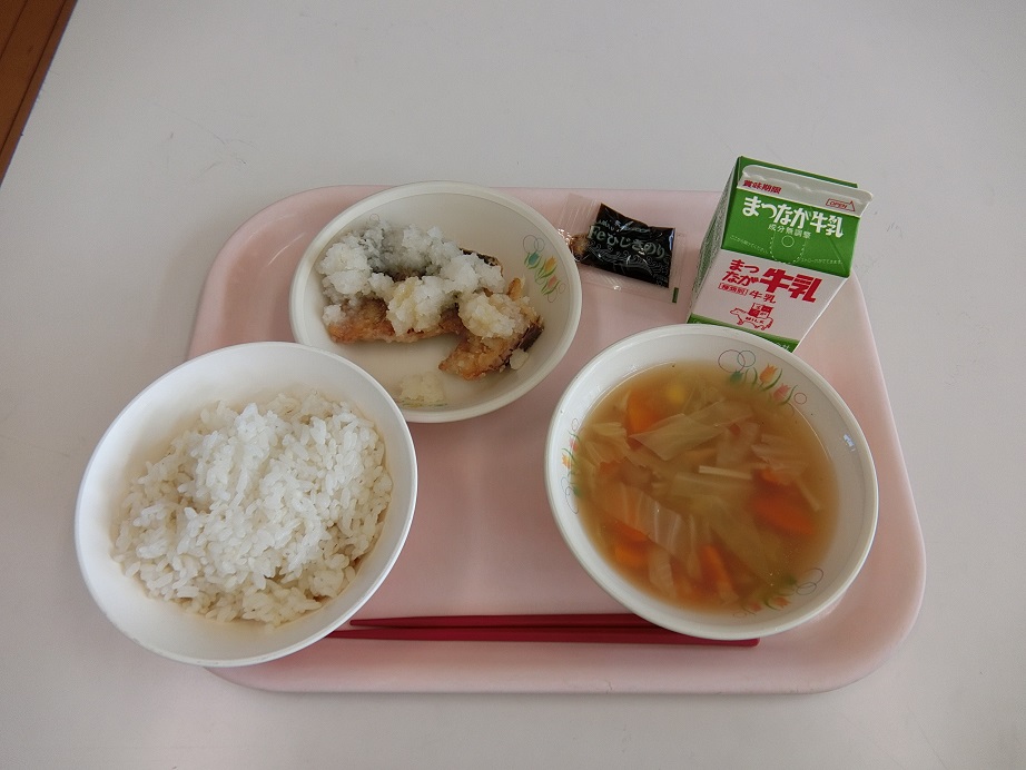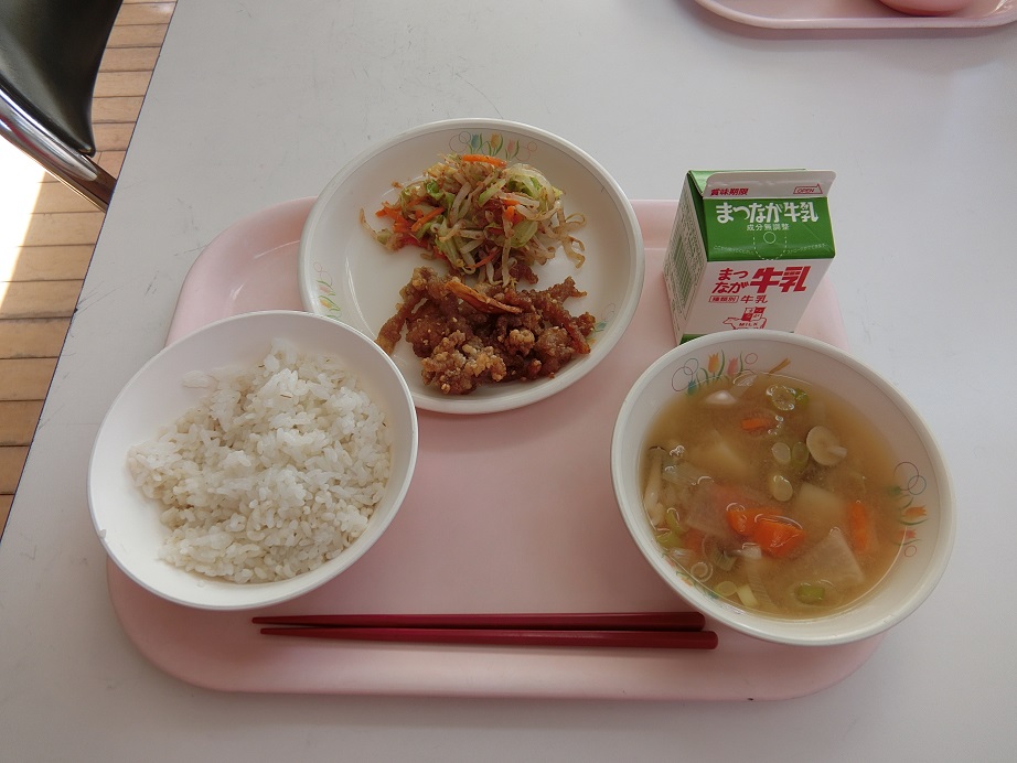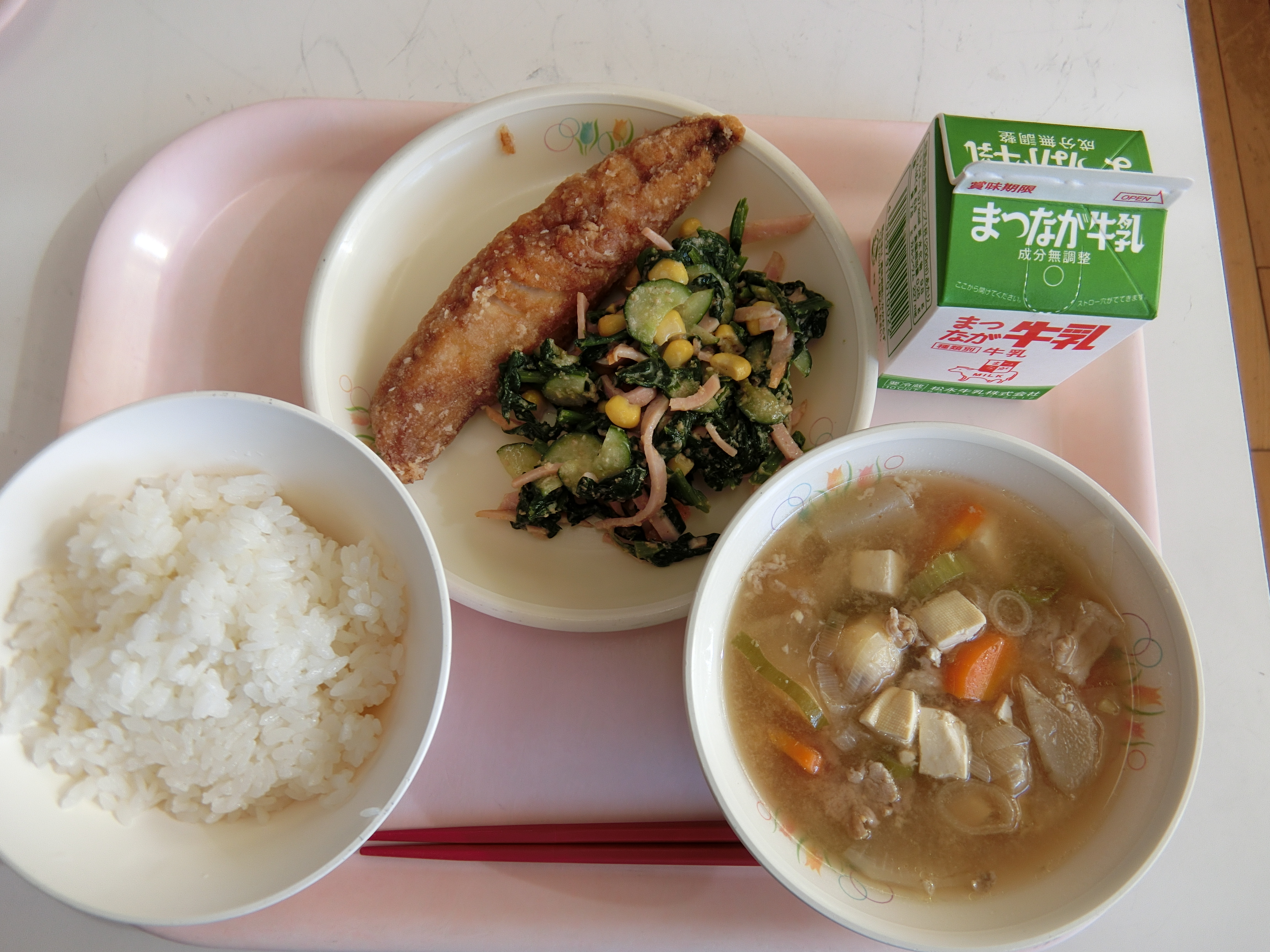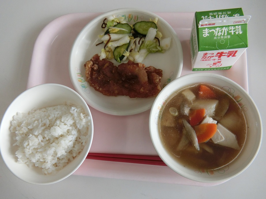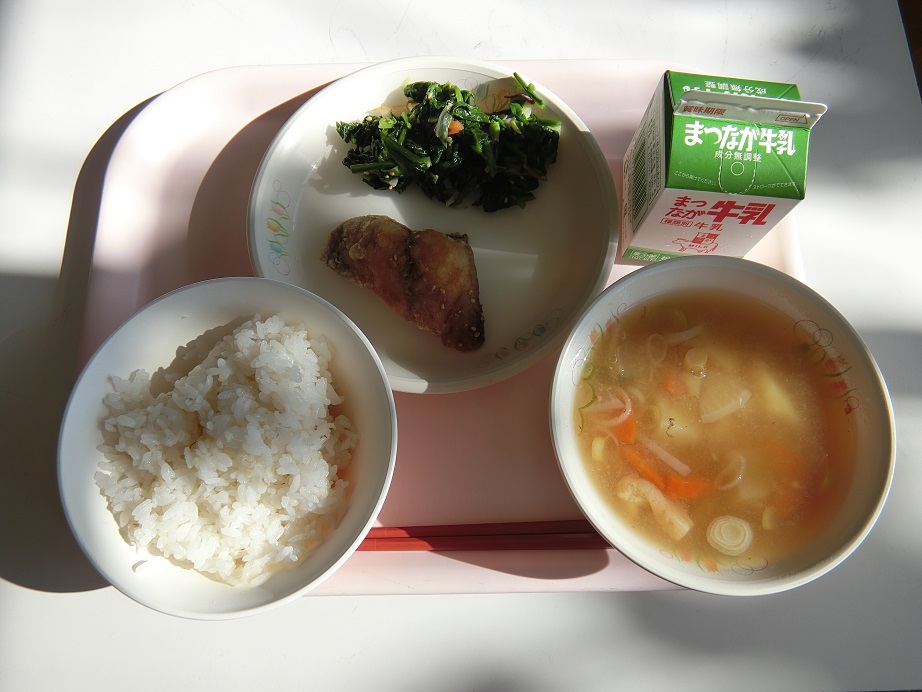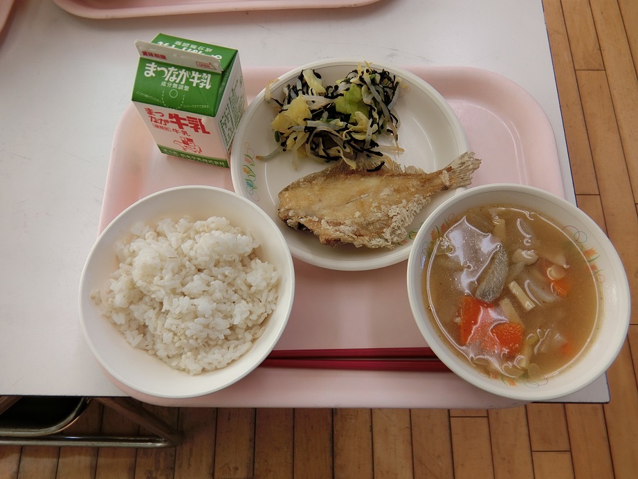 1月18日 日本型食生活献立麦ごはん、牛乳、小ガレイのから揚げ、のり和え、豚汁