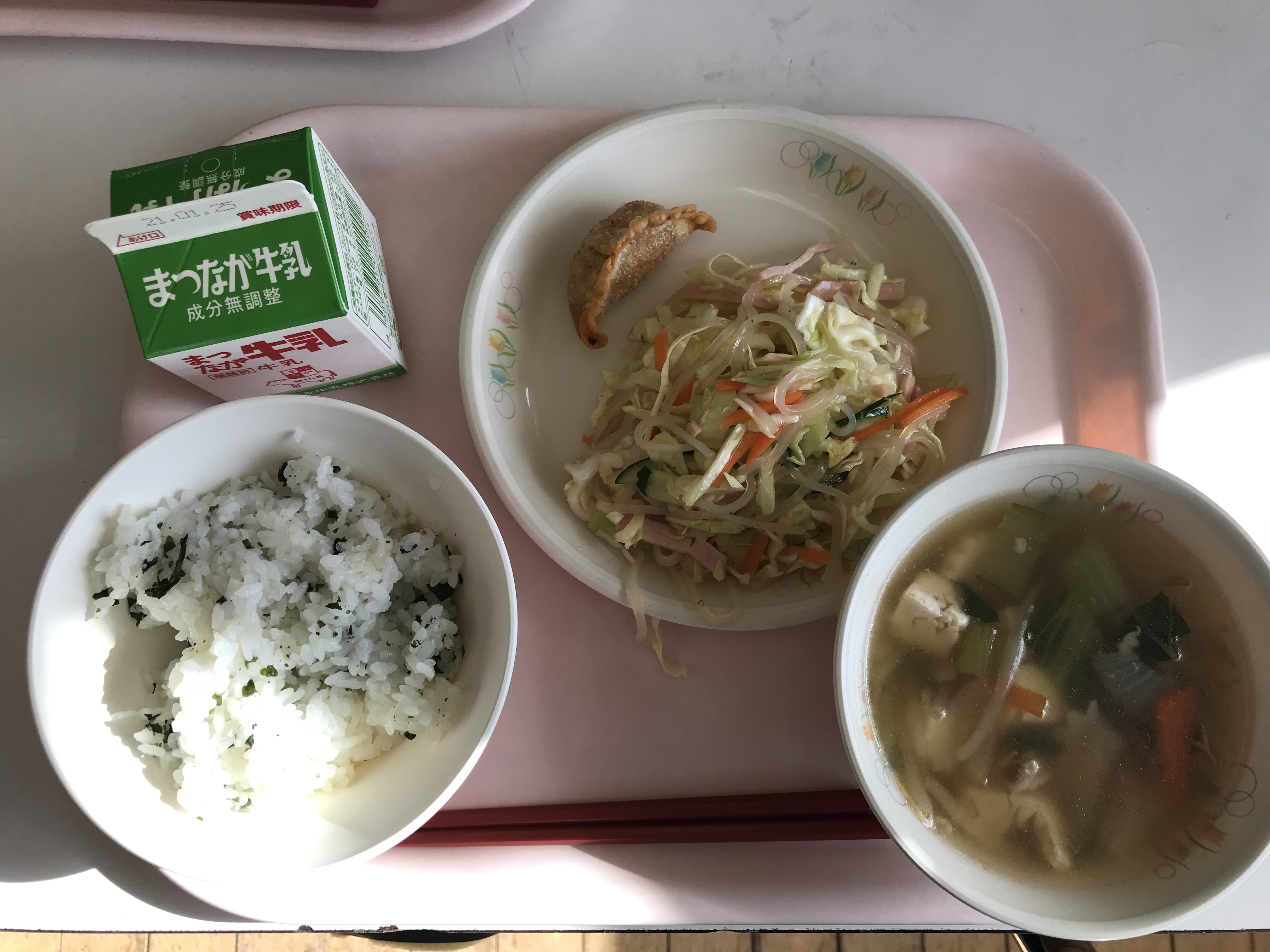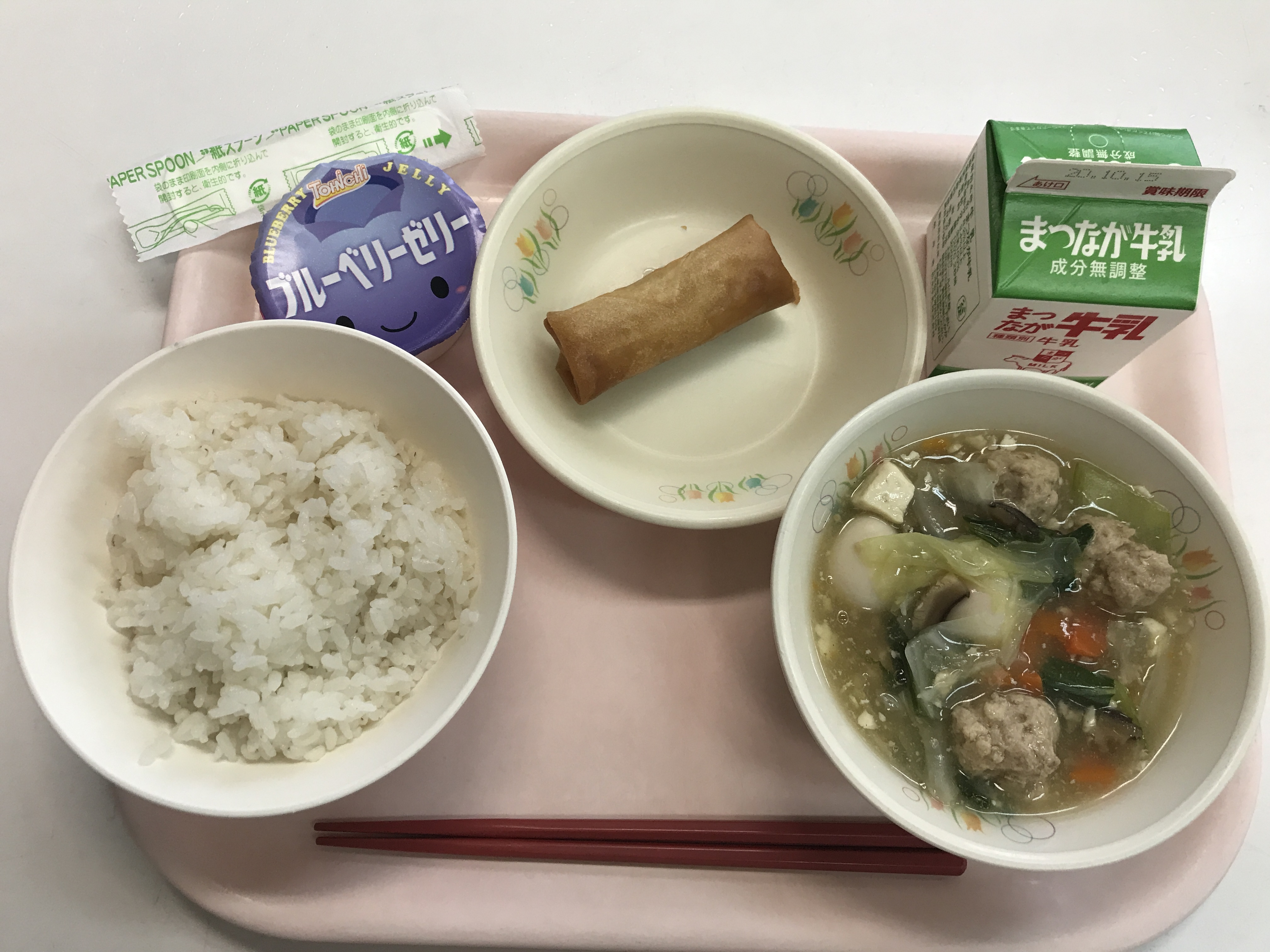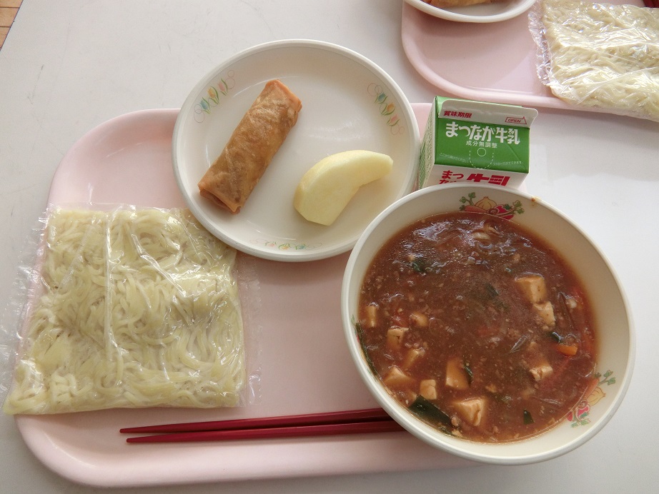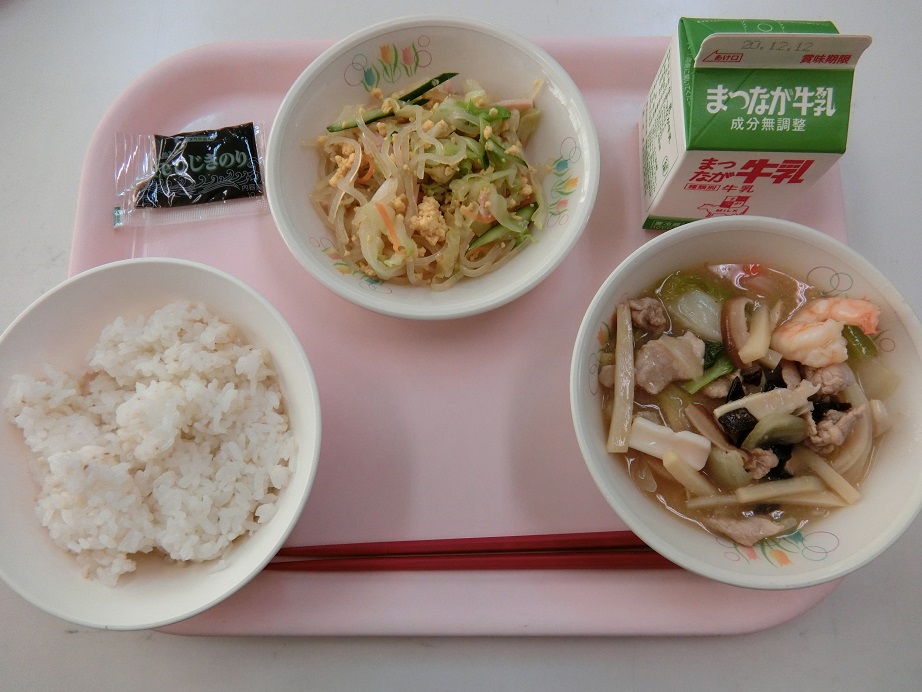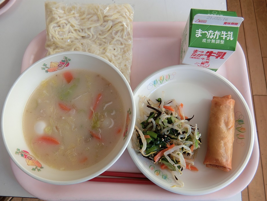 ちゃんぽんめん、牛乳、春巻き、小松菜とひじきのナムル