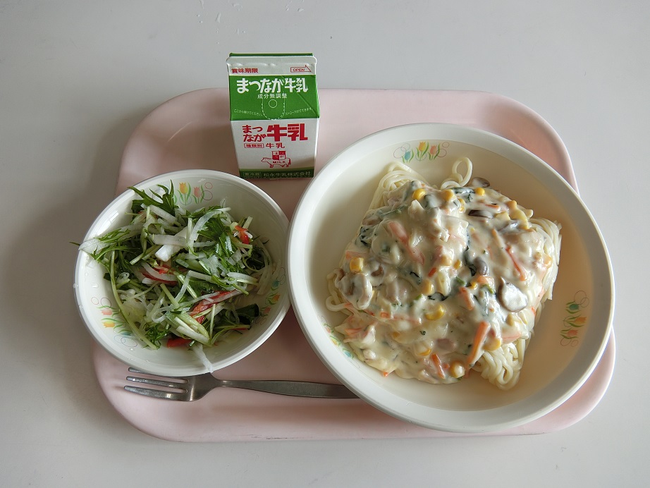 1月20日クリームスパゲッティ、牛乳、いかと水菜のマリネ