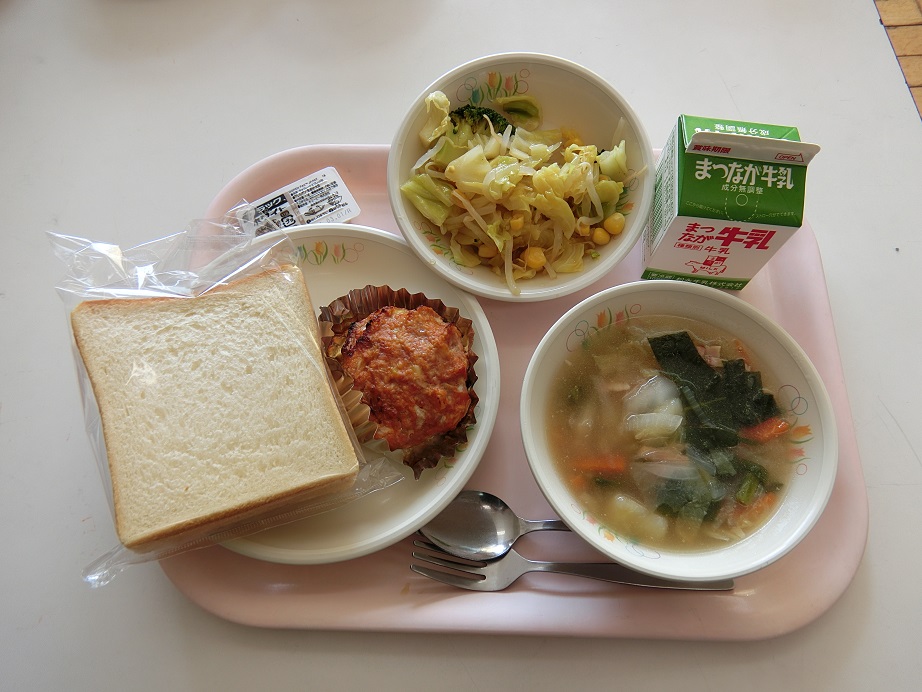 食パン、チョコレートクリーム、牛乳、ミートローフ、ブロッコリー和え、野菜スープ