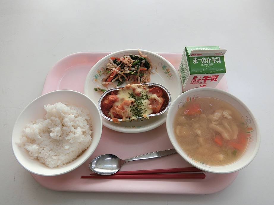 1月25日麦ごはん、牛乳、車麩のミートグラタン、ほうれん草のおひたし、打ち豆汁