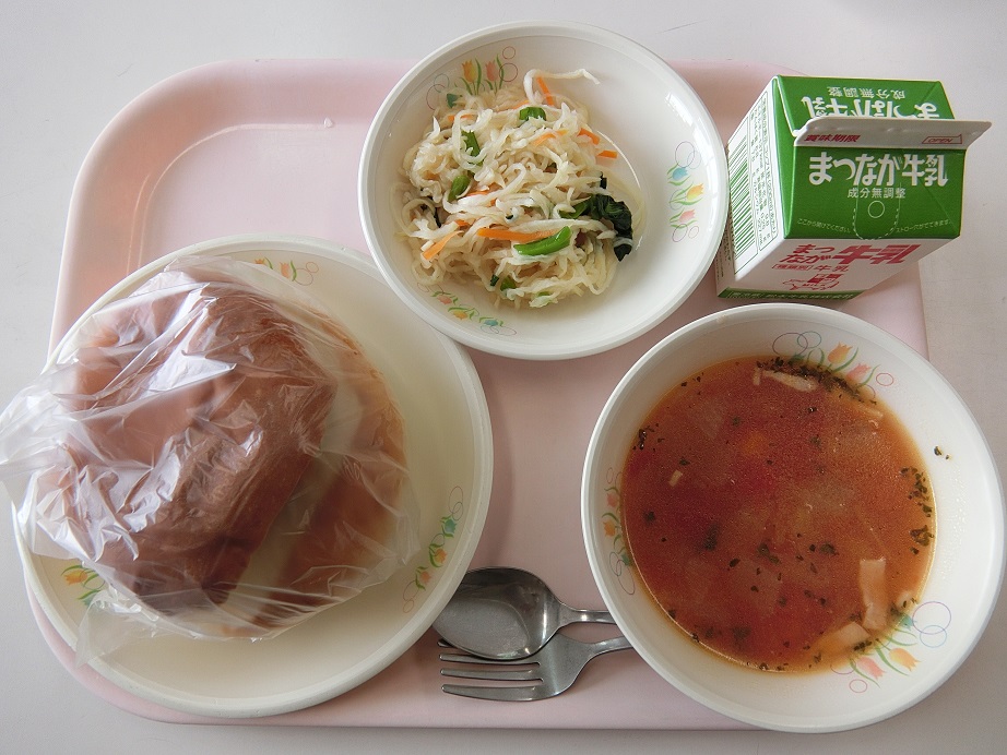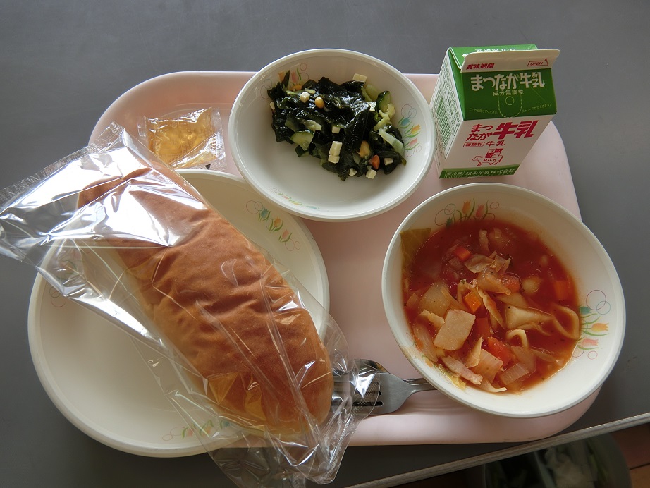 2月18日コッペパン、りんごジャム、牛乳、ミネストローネ、わかめとコーンのサラダ