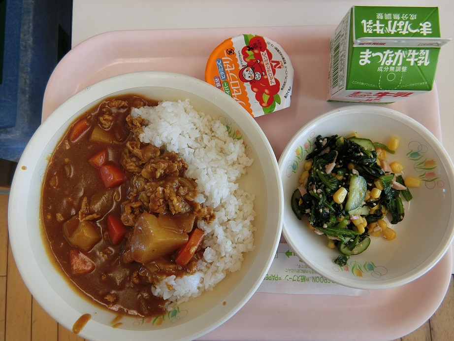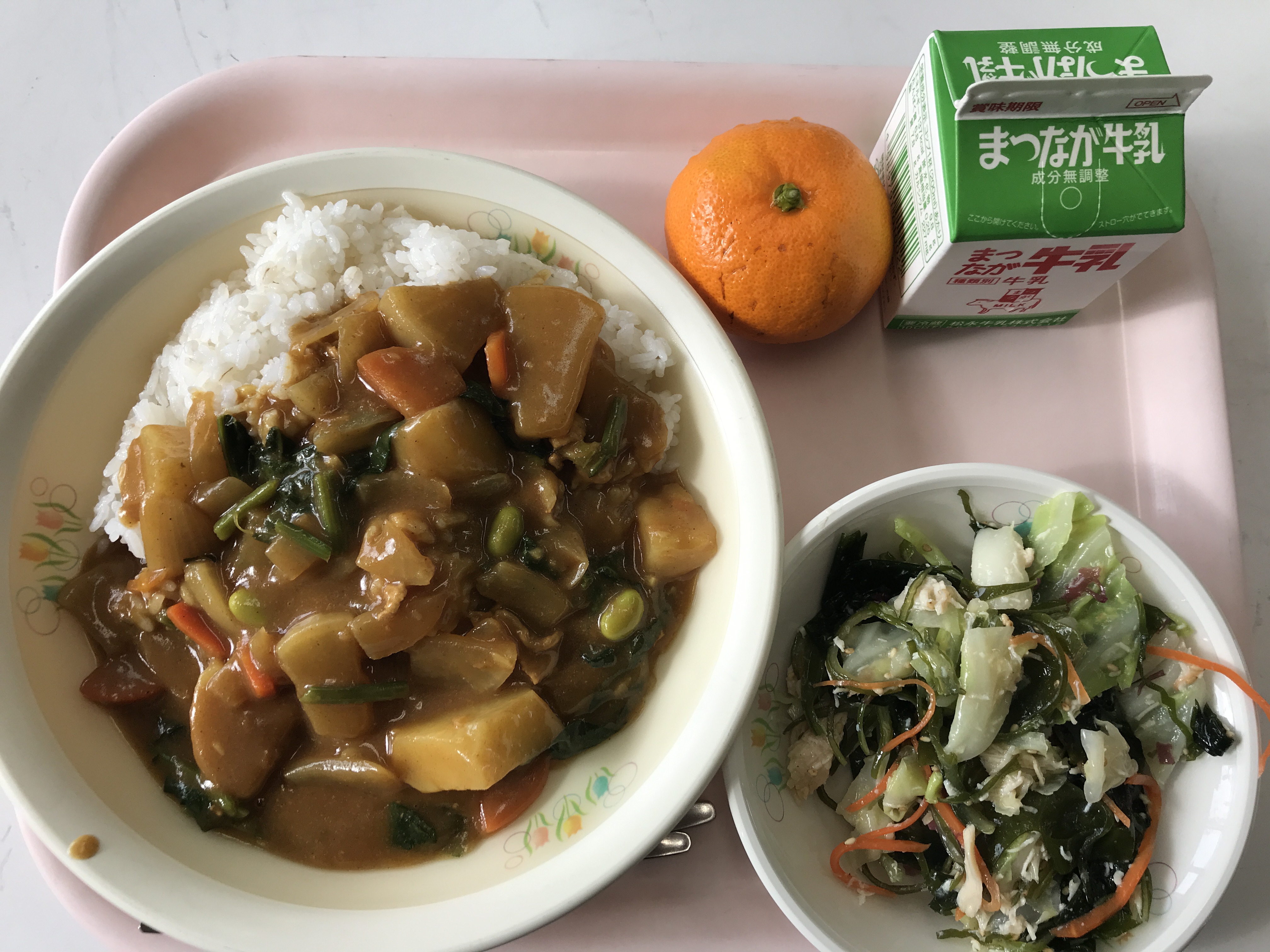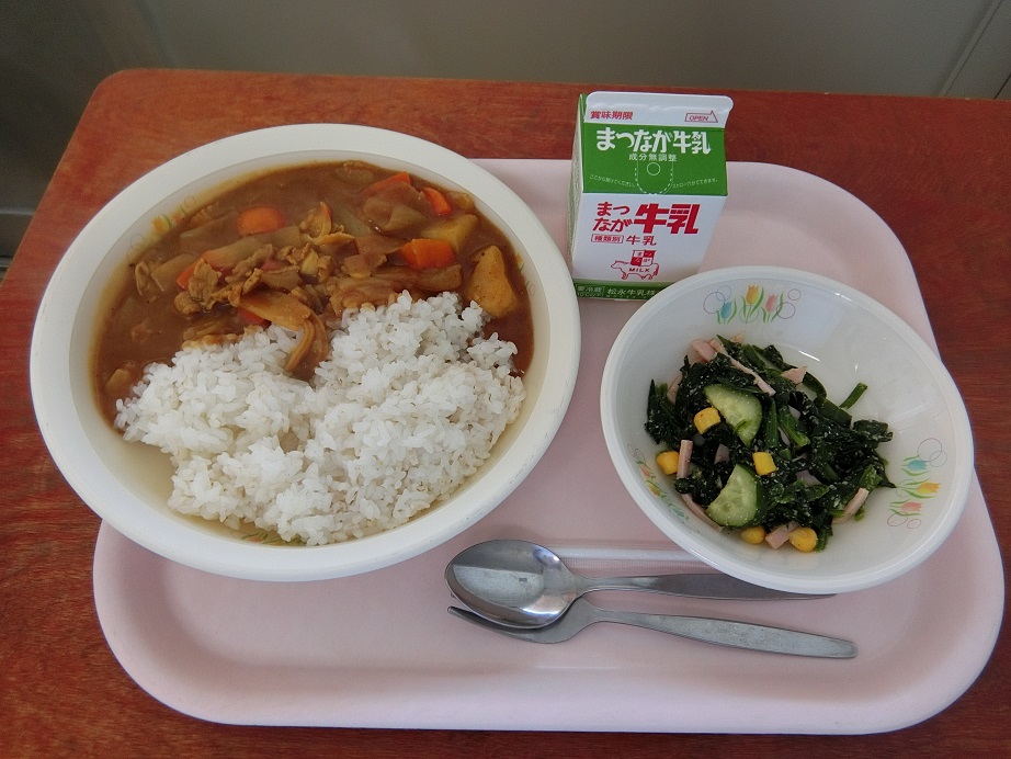3月15日ポークカレー、牛乳、ポパイサラダ、ゼリー