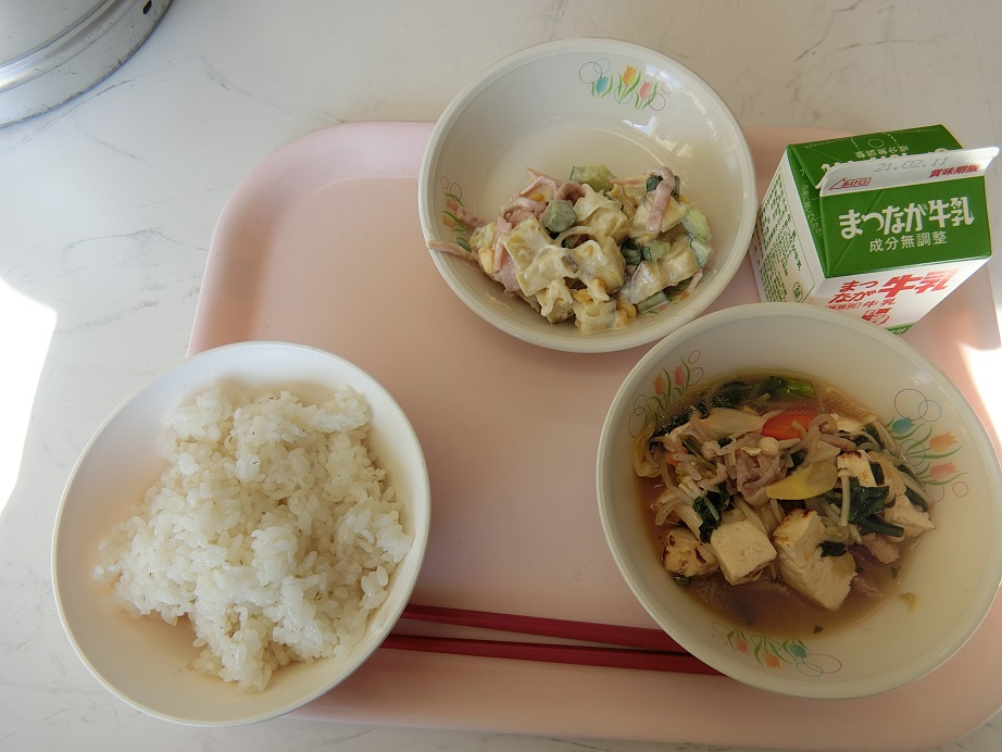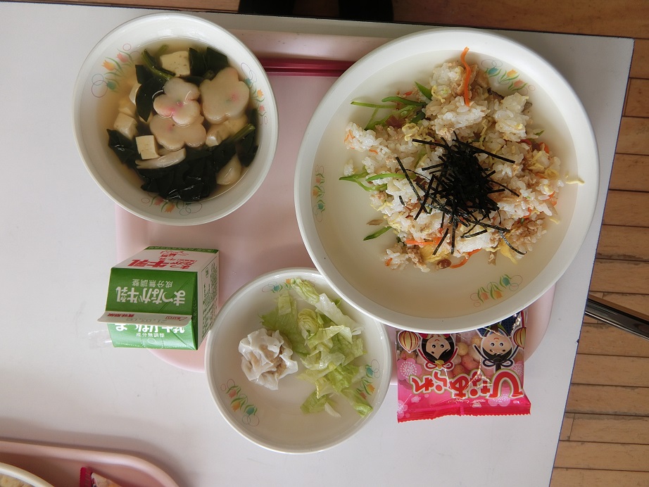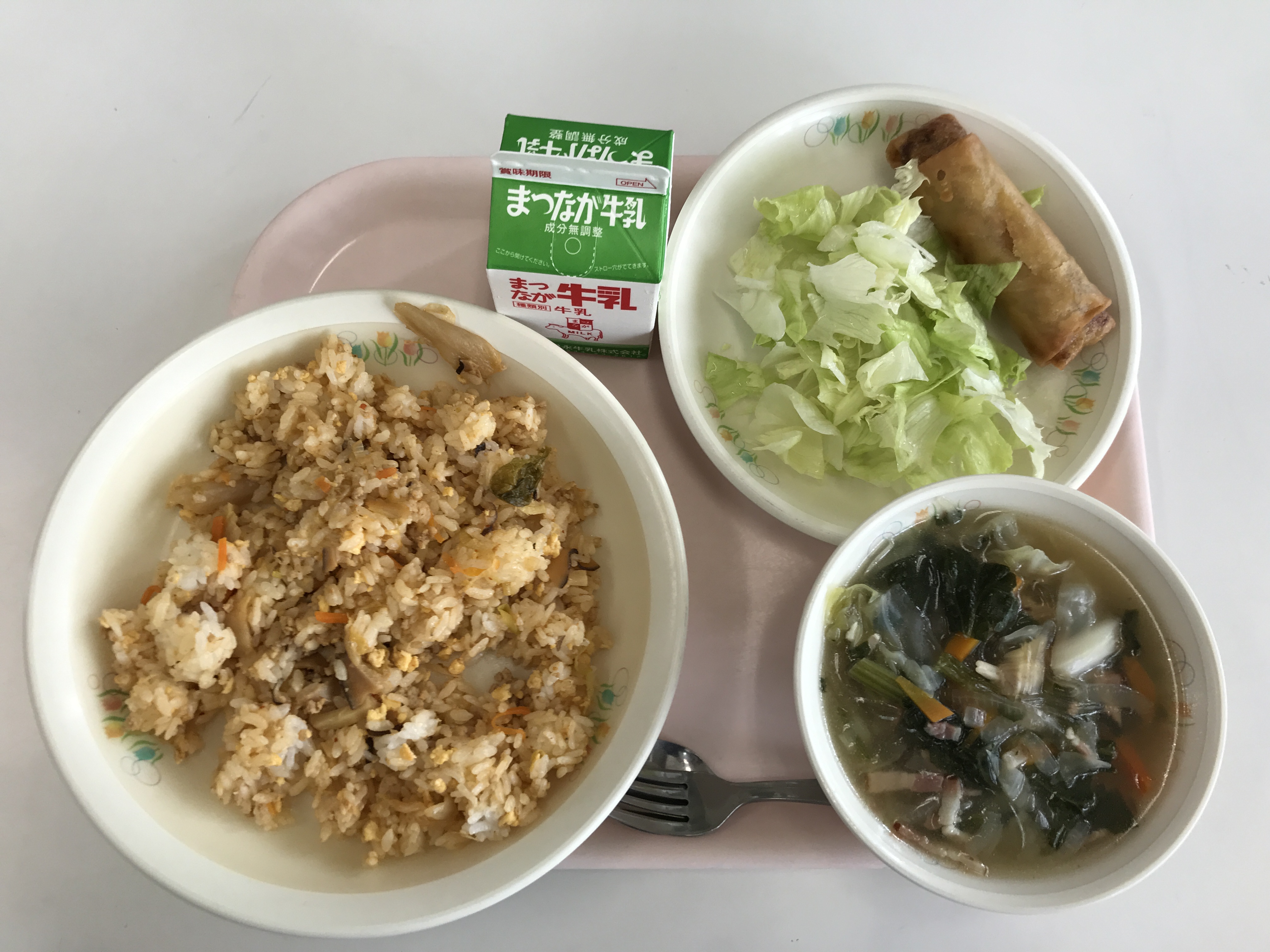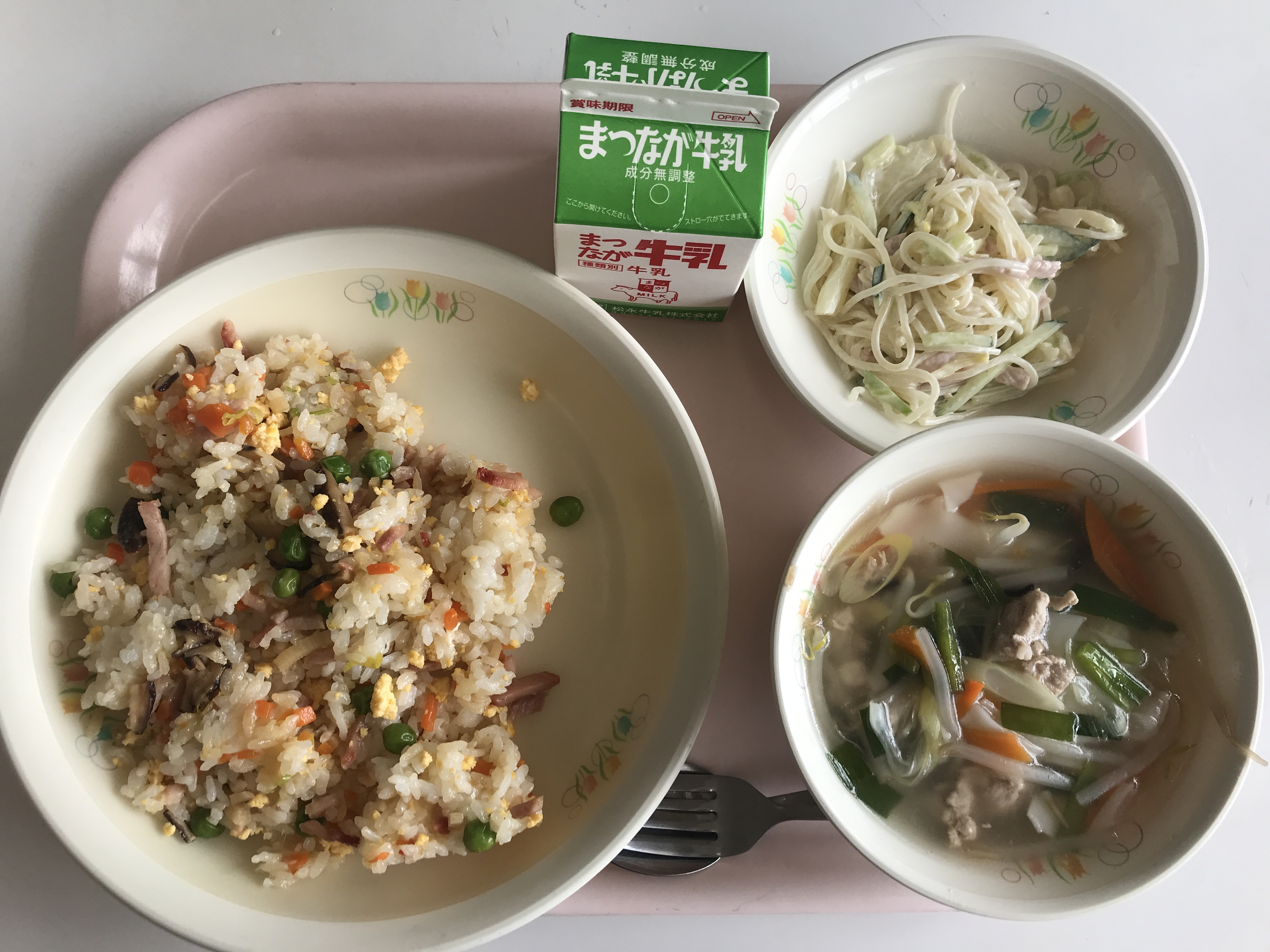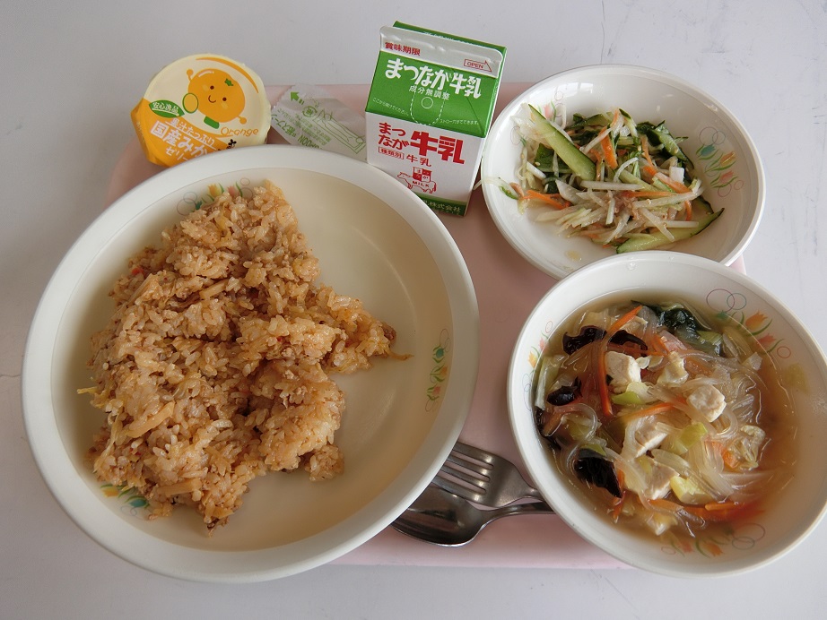 2月26日キムチチャーハン、牛乳、大根サラダ、春雨スープ