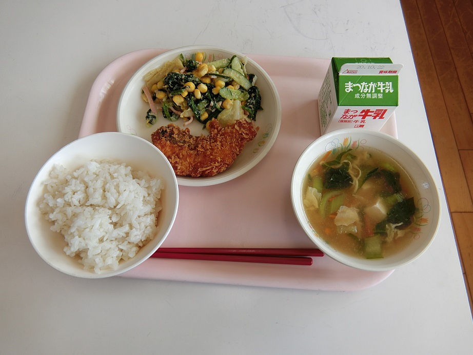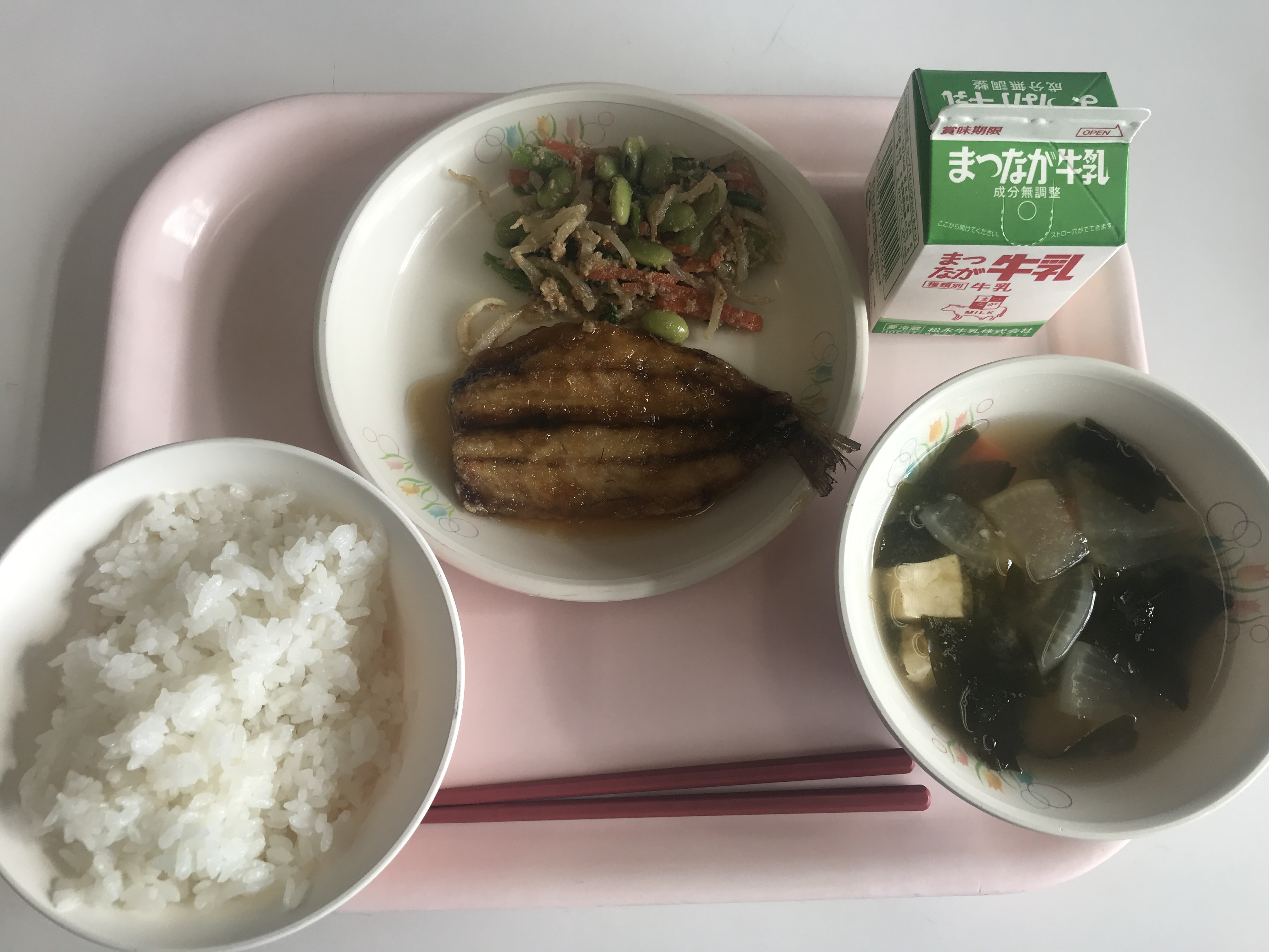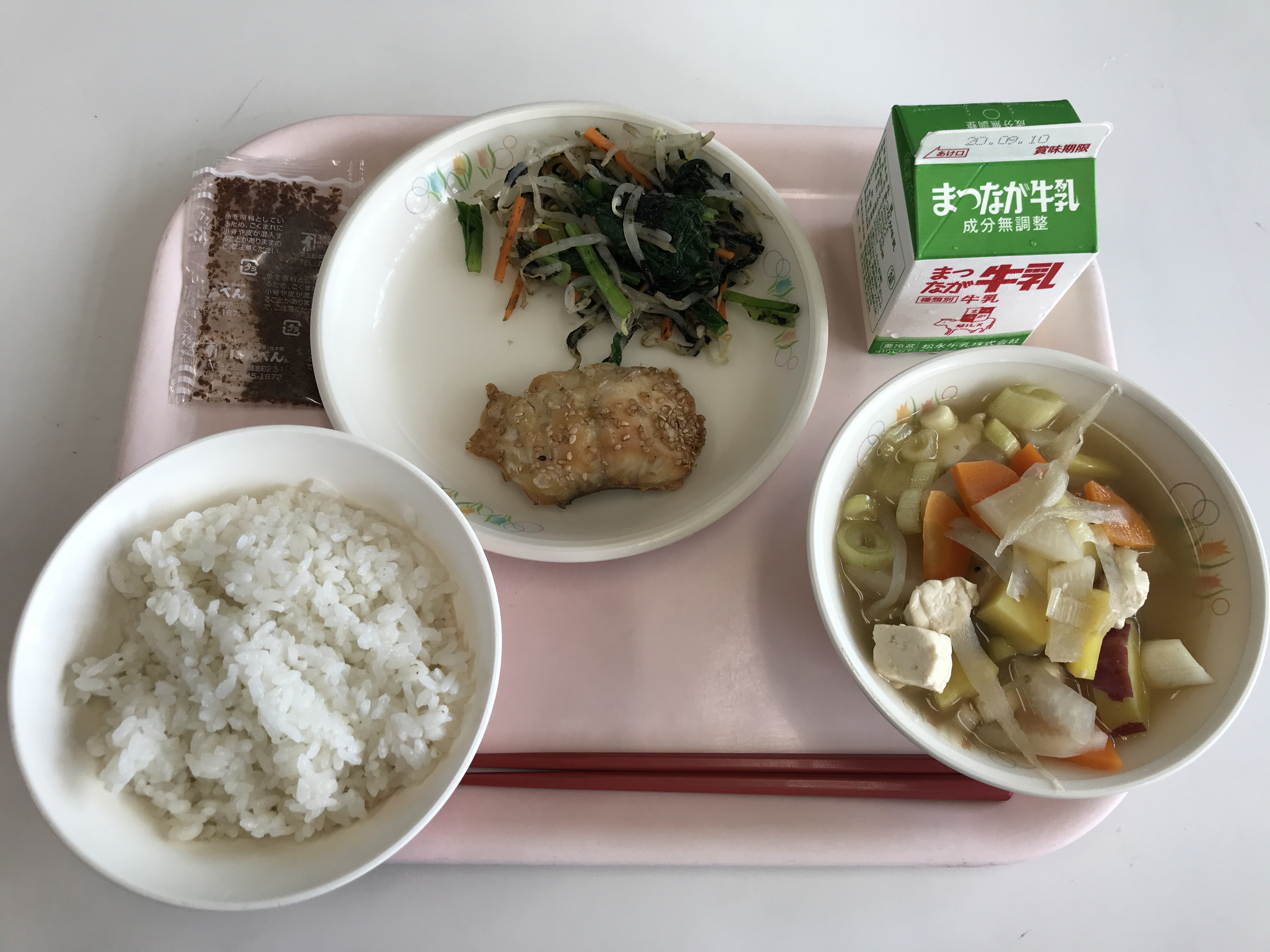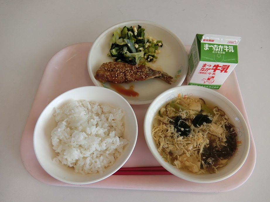 9月25日 県産水産物(相馬産ヒラメ)を活用した給食ごはん、牛乳、ヒラメのさざれ焼き(相馬産)、青菜のごまあえ、青のりのみそ汁