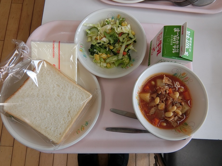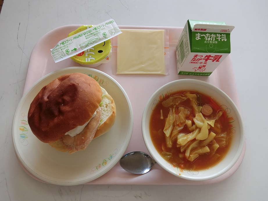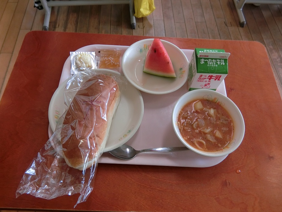 8月27日鉄分アップ献立コッペパン、ファイバージャム、ミネストローネ、牛乳、スイカ、チーズ