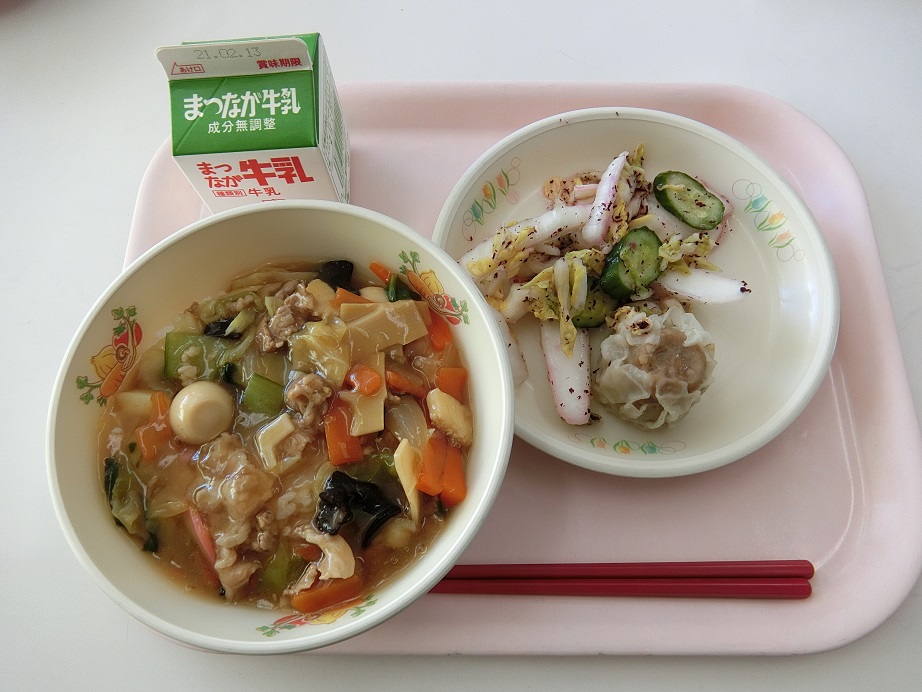 2月8日中華丼、牛乳、ポークシューマイ、ゆかり漬