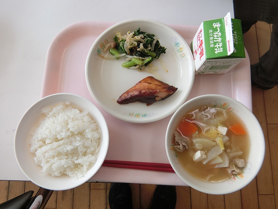 2月9日 学校給食食材無償提供事業 日本型食生活献立麦ごはん、牛乳、ぶりの照り焼き、菜の花和え、豚汁