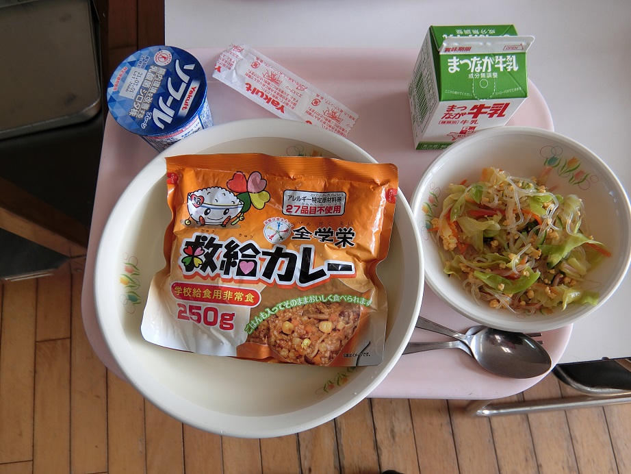 2月12日 防災備蓄献立、カルシウムアップ献立カレーライス(学校給食用非常食)、牛乳、春雨サラダ、ヨーグルト