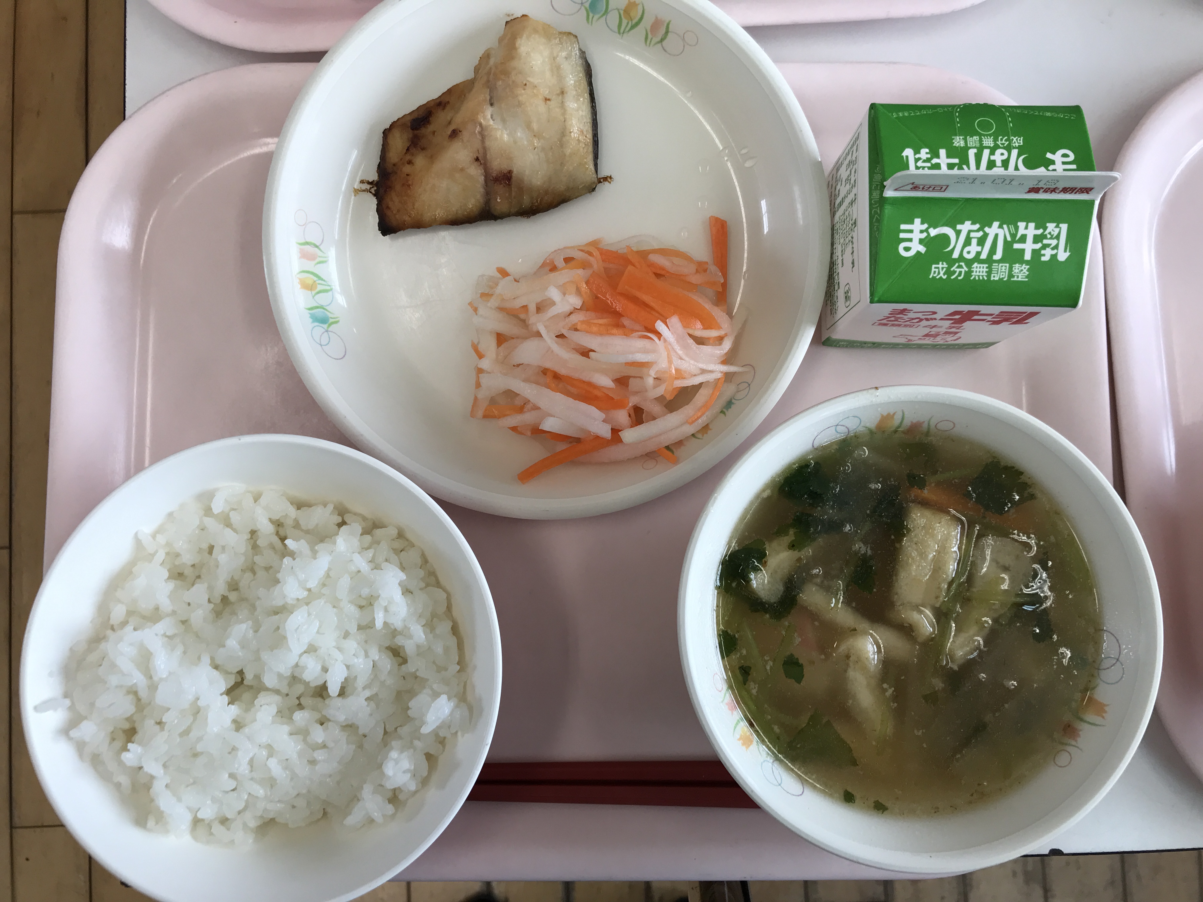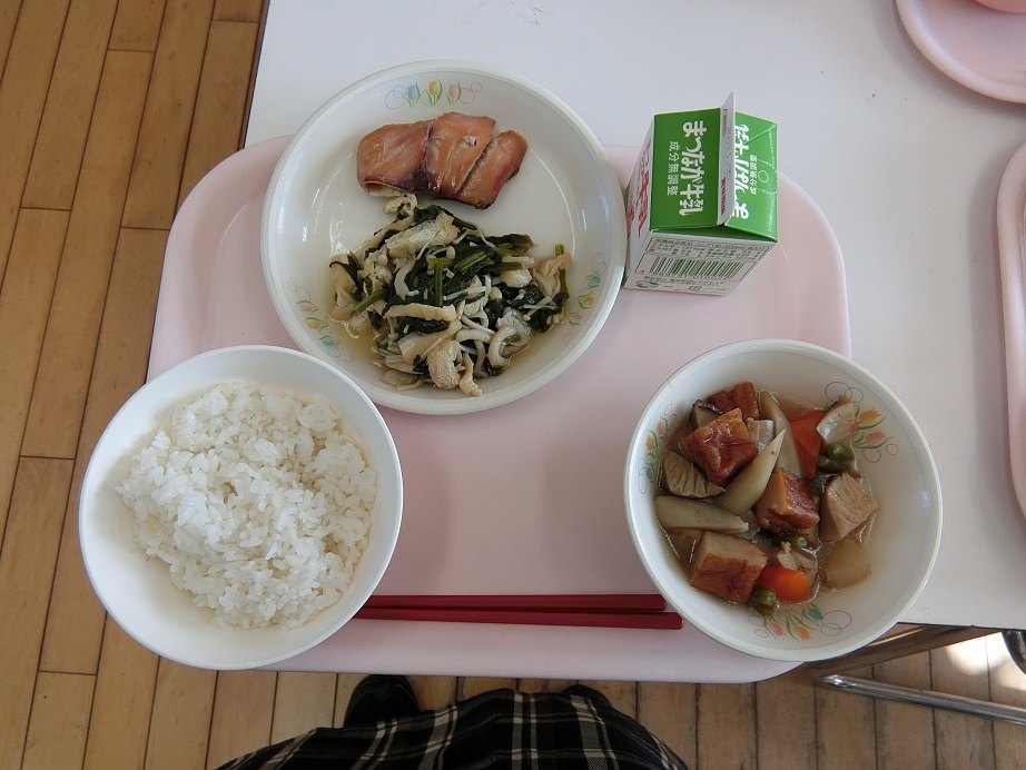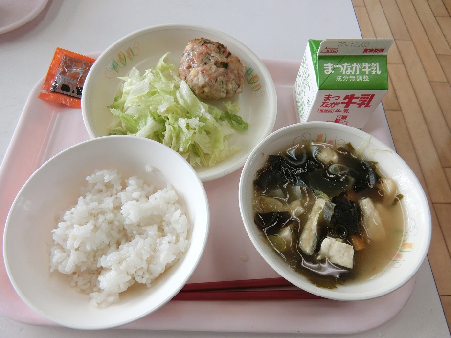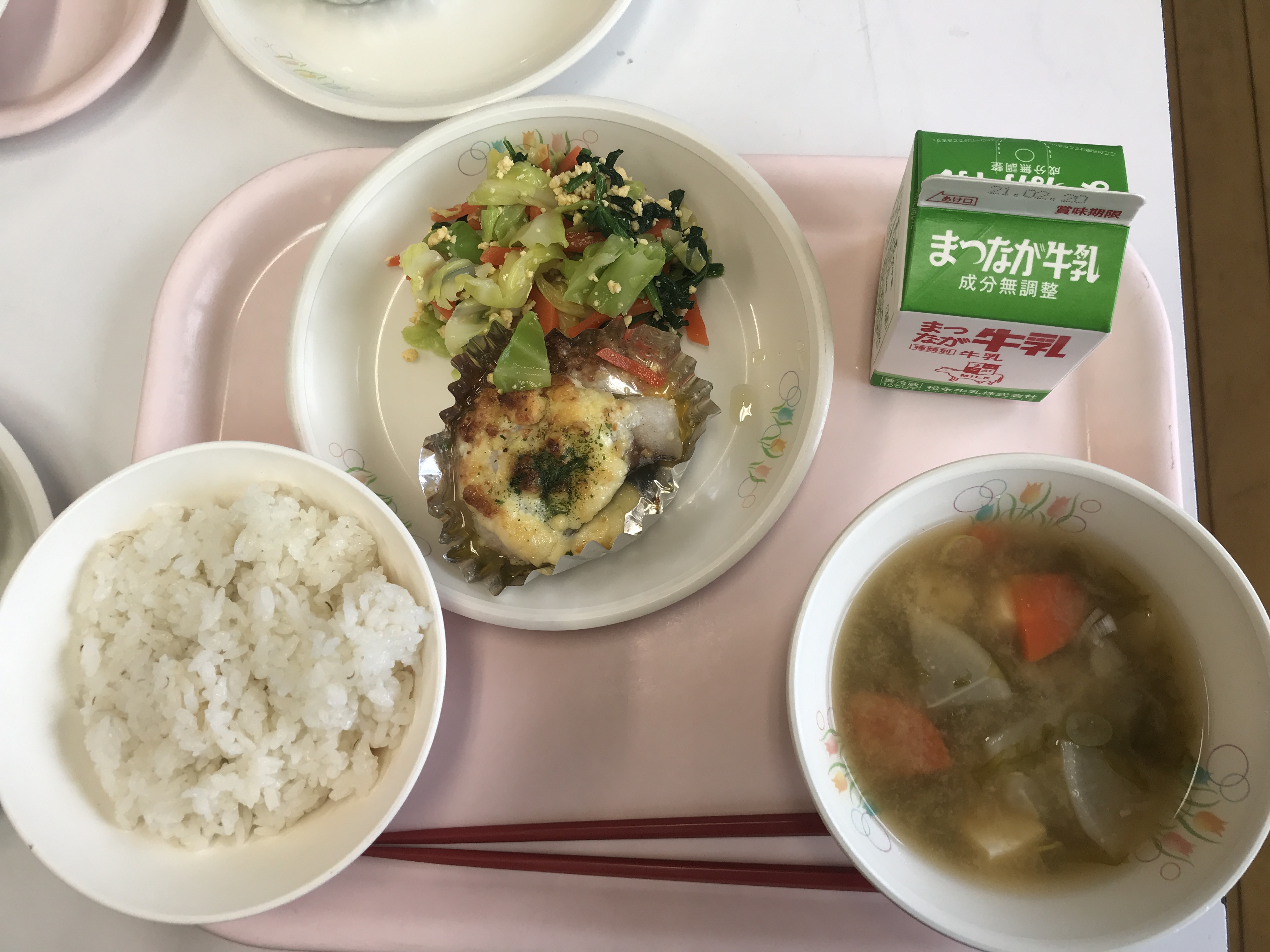 12月18日 日本型食生活献立・そうま うまうま献立麦ごはん、牛乳、たらのマヨネーズ焼き、レンコンのきんぴら、油揚げの味噌汁