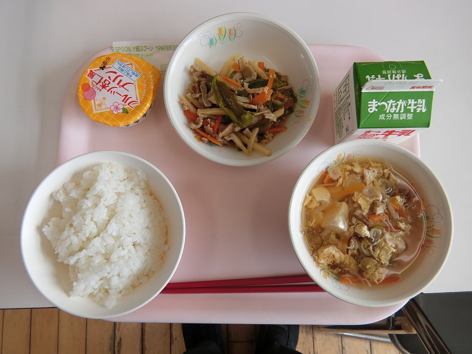 2月16日ごはん、青椒肉絲(チンジャオロースー)、牛乳、もずくスープ