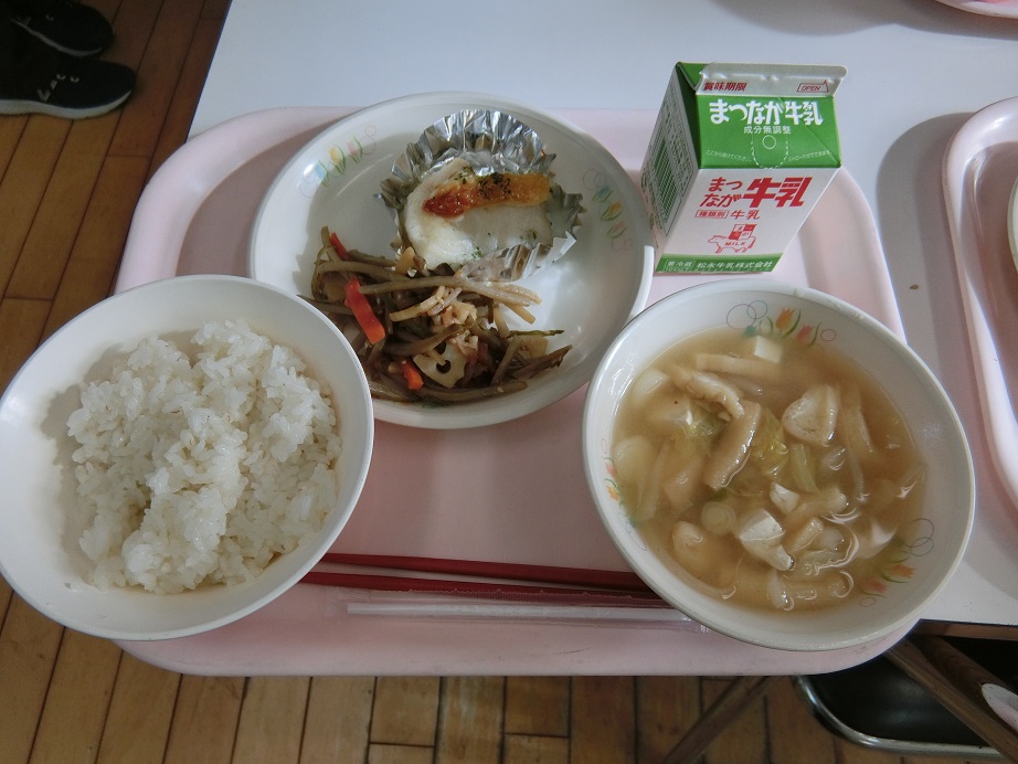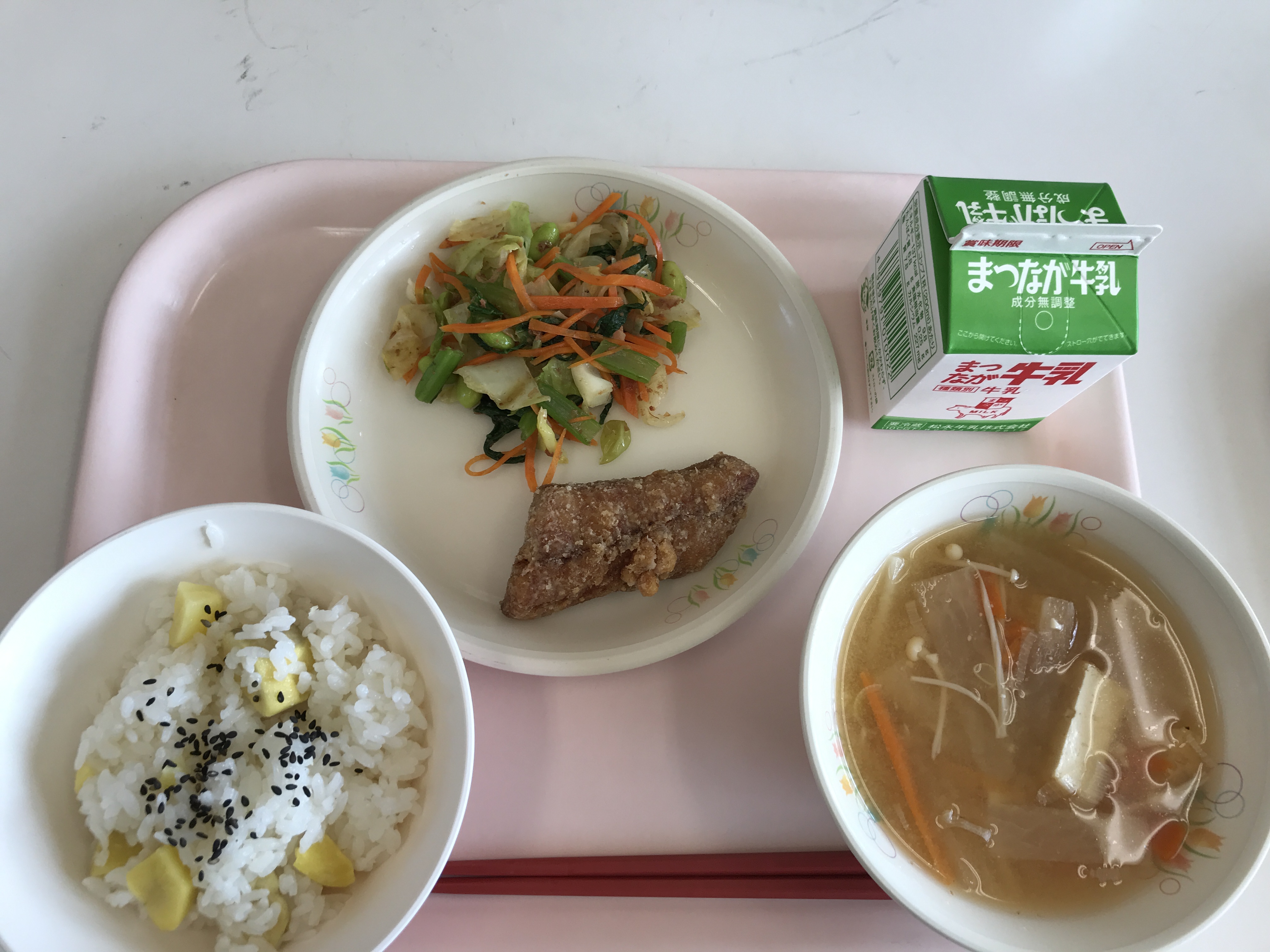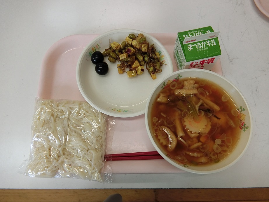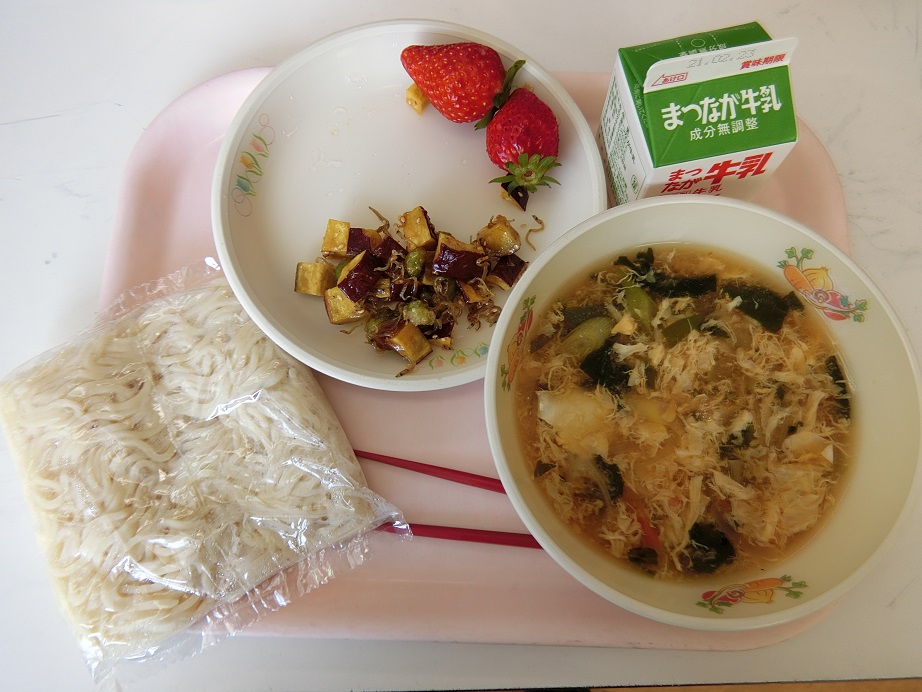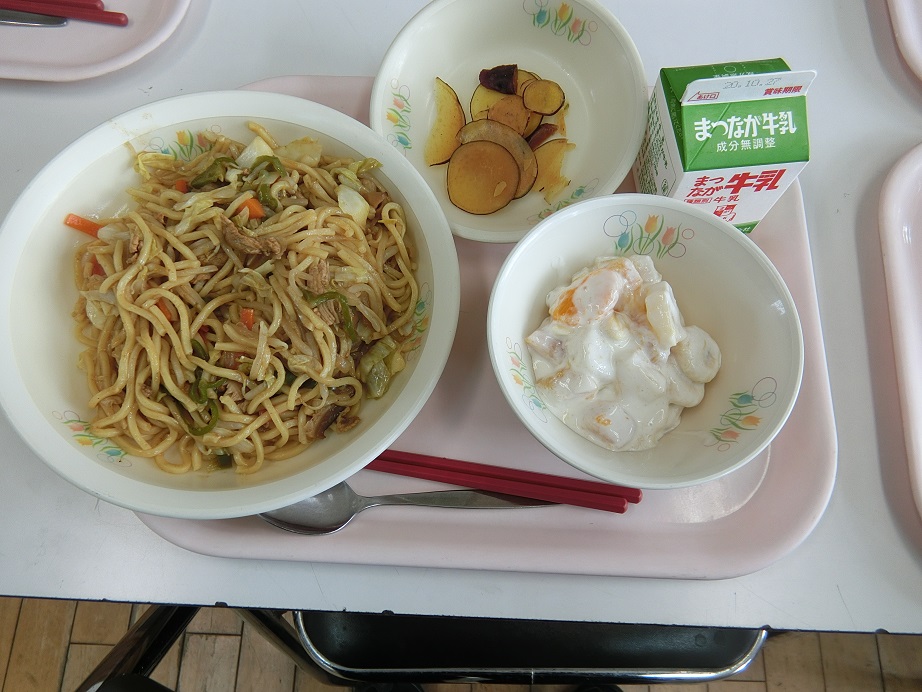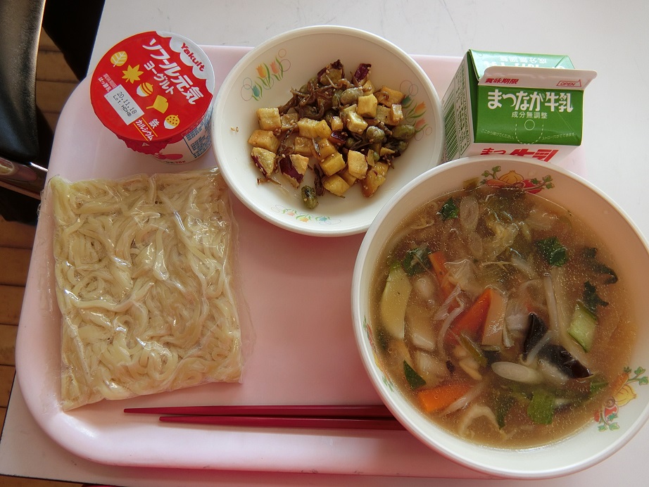 11月4日五目ラーメン、牛乳、さつまいもと小女子の揚げ煮、元気ヨーグルト