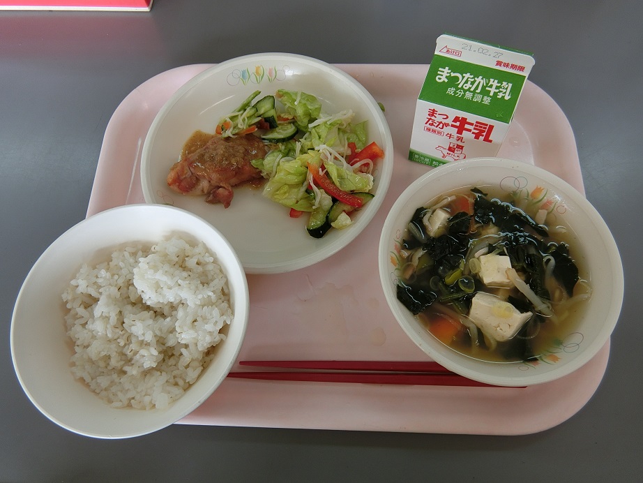 2月22日 鉄分アップ献立麦ごはん、牛乳、鶏肉のごまみそやき、レモン酢あえ、ほうれん草とあさりのスープ
