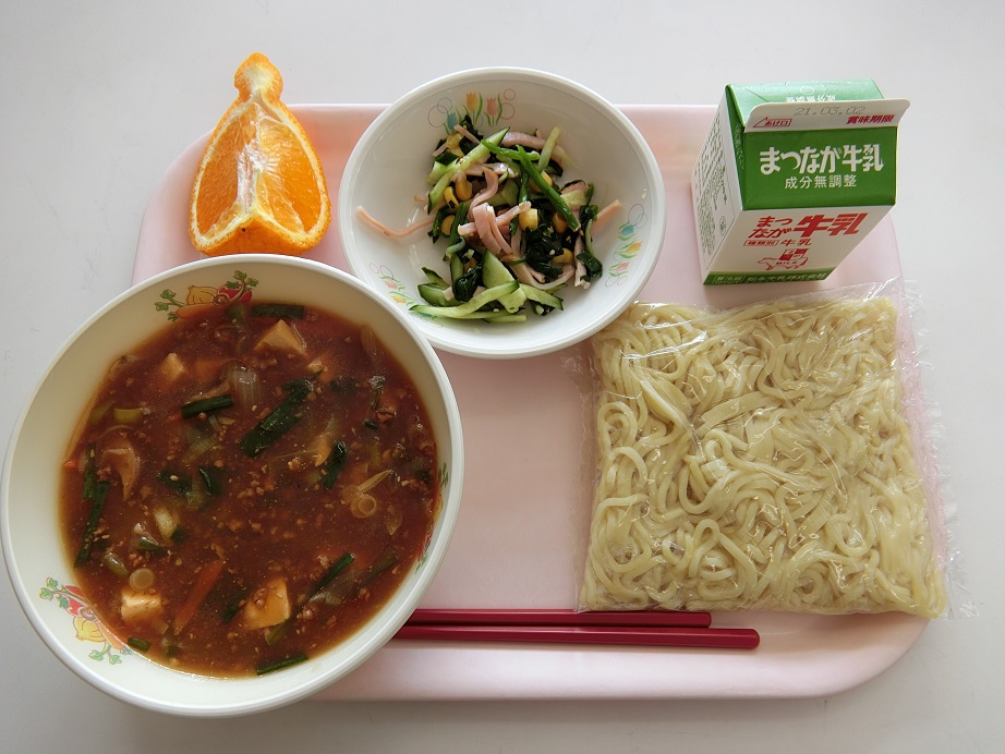 2月24日マーボーめん、牛乳、ポパイサラダ、デコポン