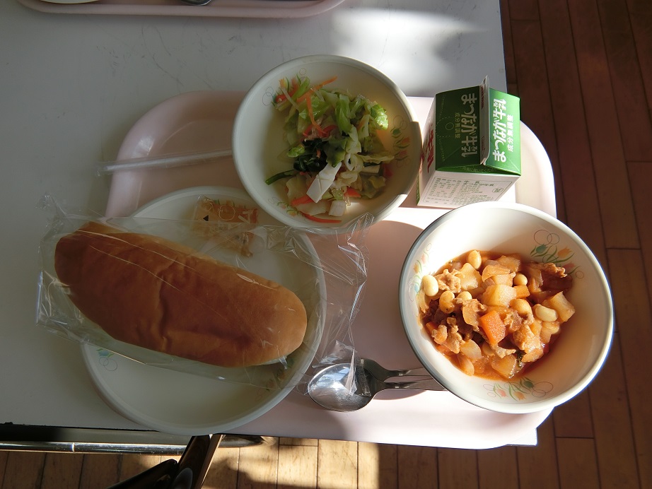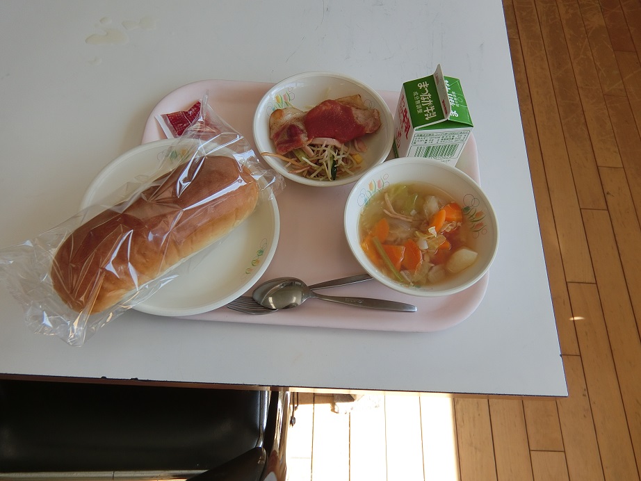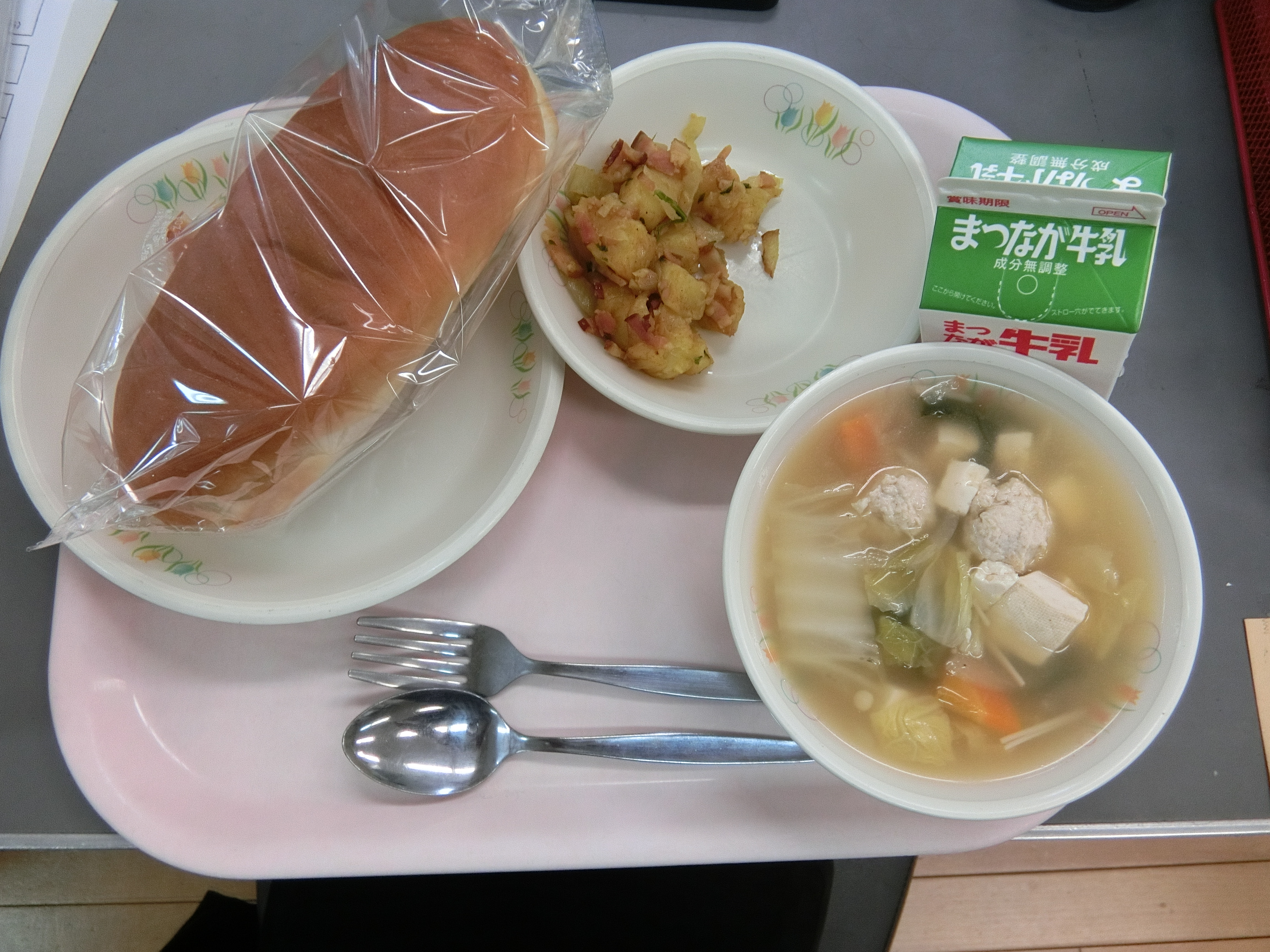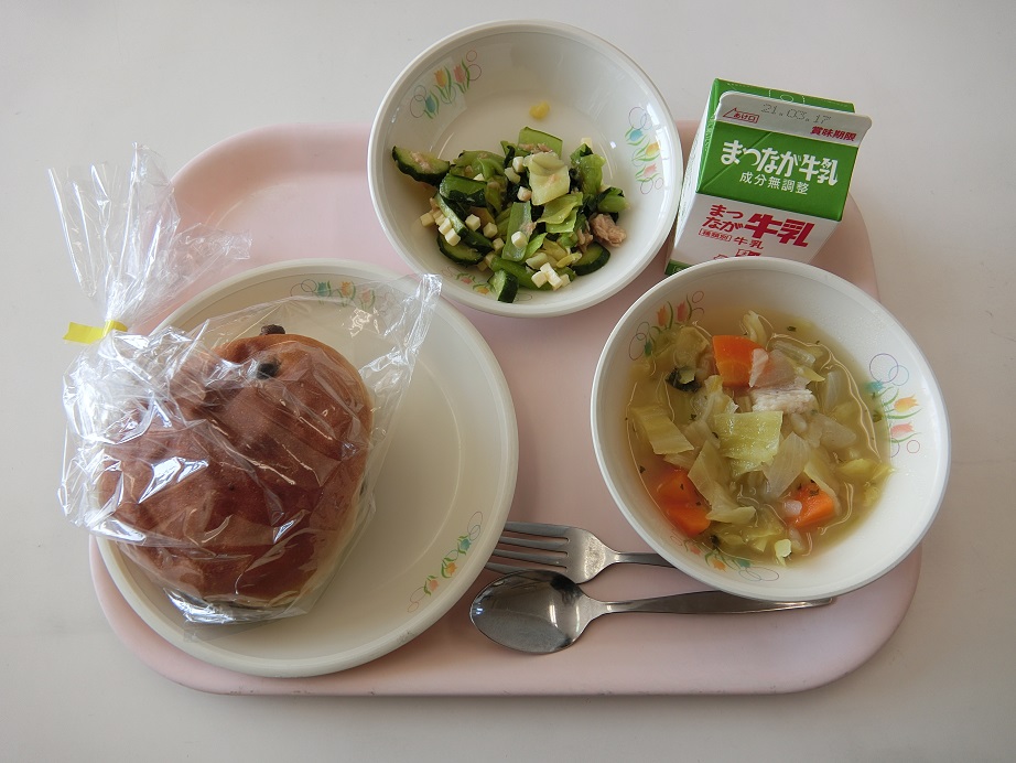 3月11日チョコチップパン、牛乳、小松菜の和風サラダ、ポトフ