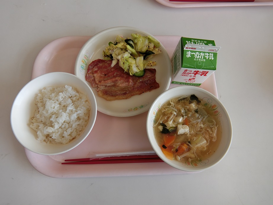 麦ごはん、牛乳、豚肉の焼きバーベキューソース、浅漬け(塩昆布)、里芋汁