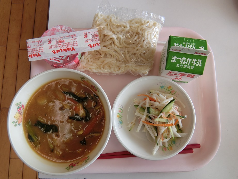 3月3日 カルシウムアップ献立カレーうどん、牛乳、大根とハムのサラダ、ヨーグルト