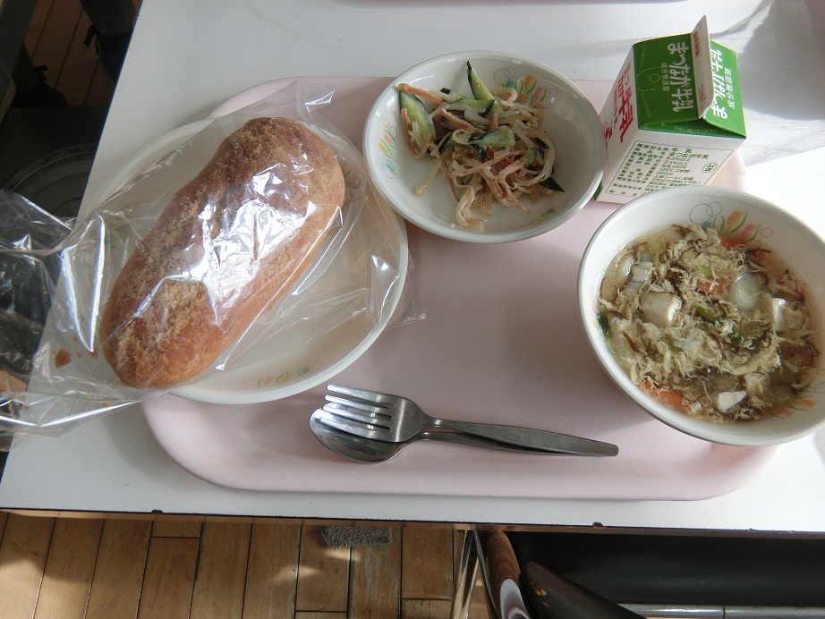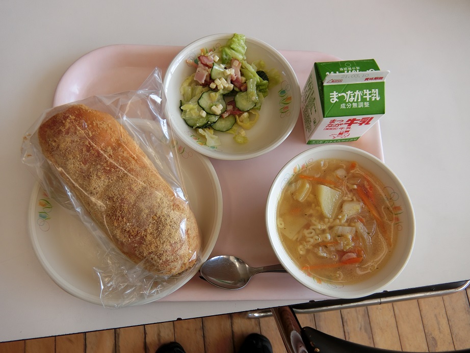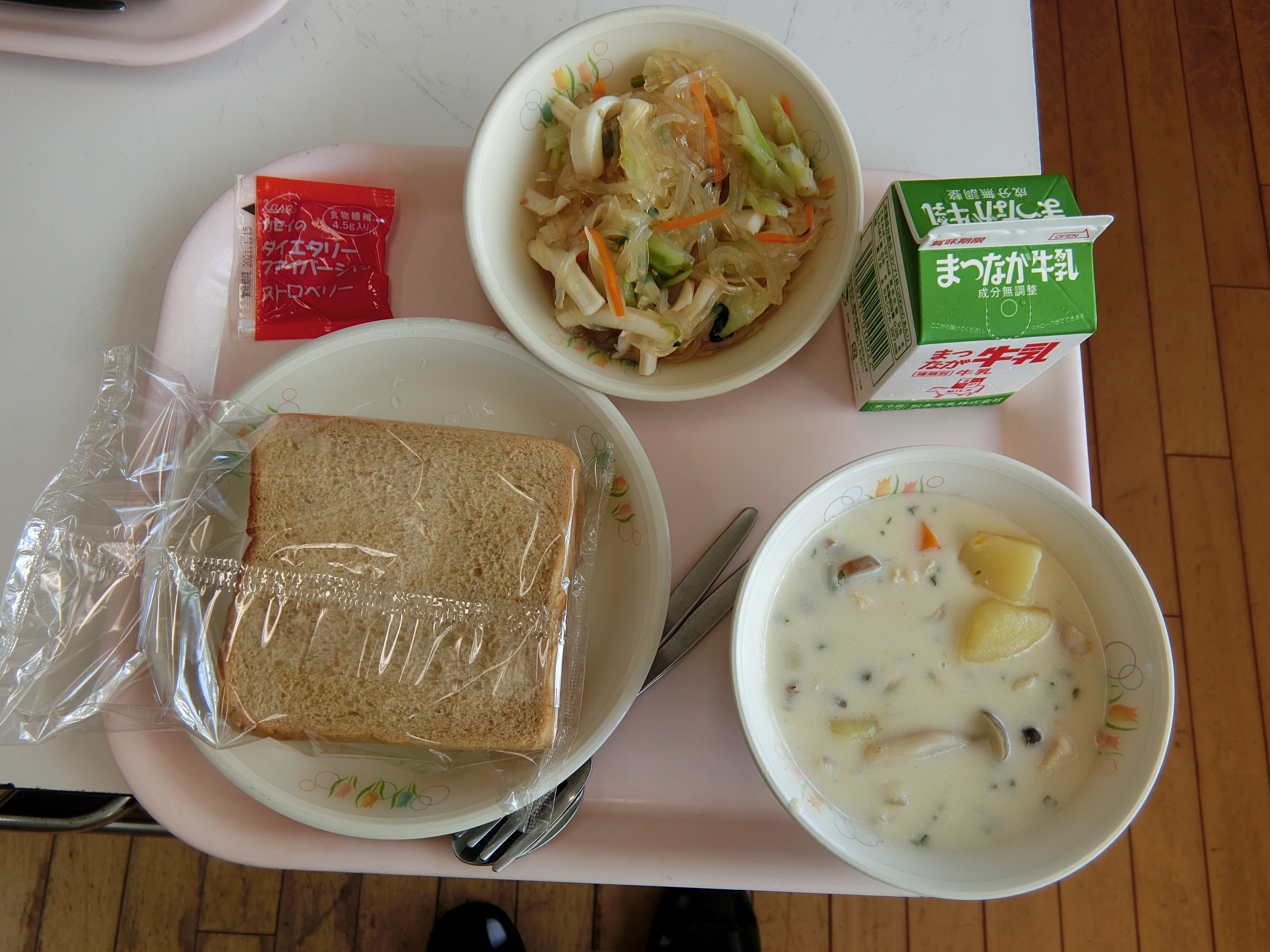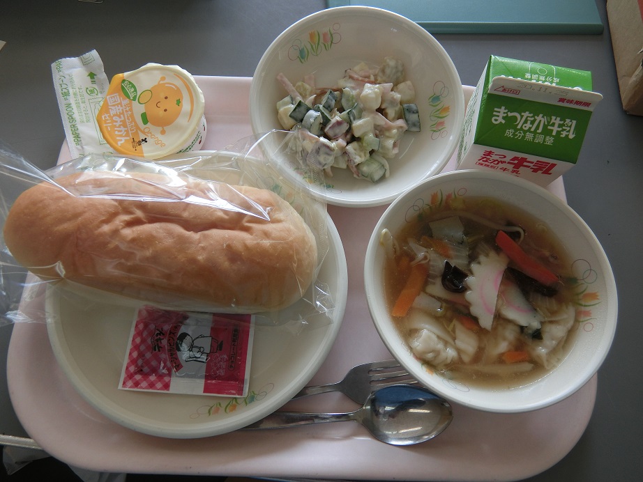 コッペパン、牛乳、マーシャルビーンズ、ワンタンスープ、スイートポテトサラダ、ゼリー
