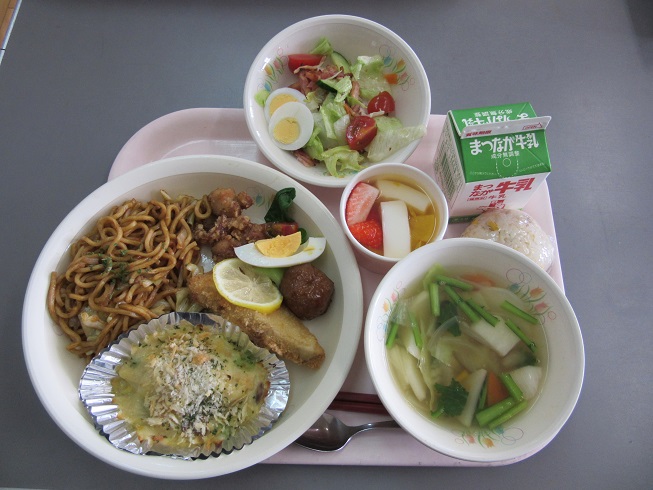 3月5日 卒業お祝い給食6年生だけの限定メニューです。とっても豪華ですね。ツナピラフ、やきそば、唐揚げ、グラタン、魚のフライ、肉団子、フルーツ杏仁、コンソメスープ、グリーンサラダ、牛乳