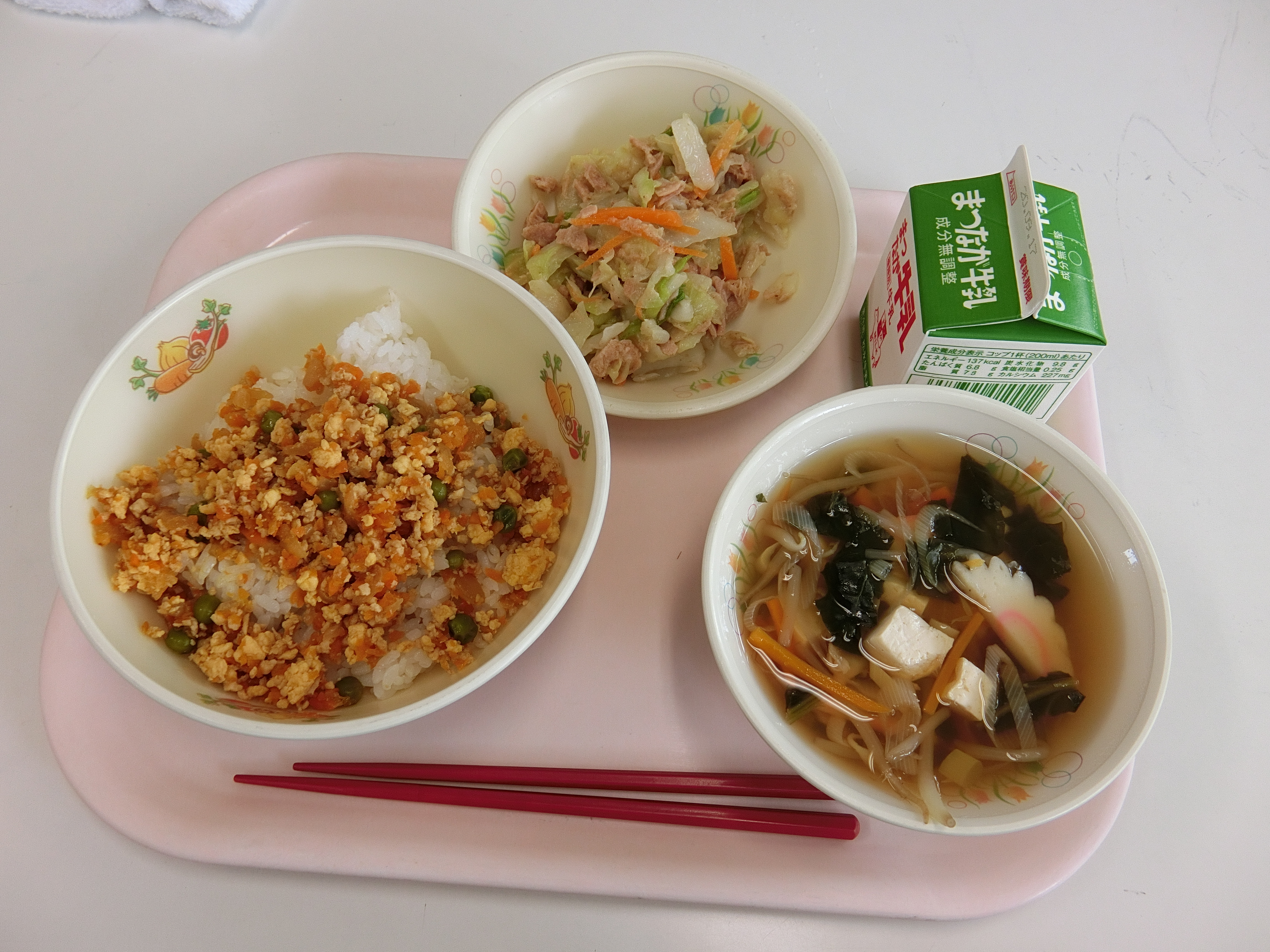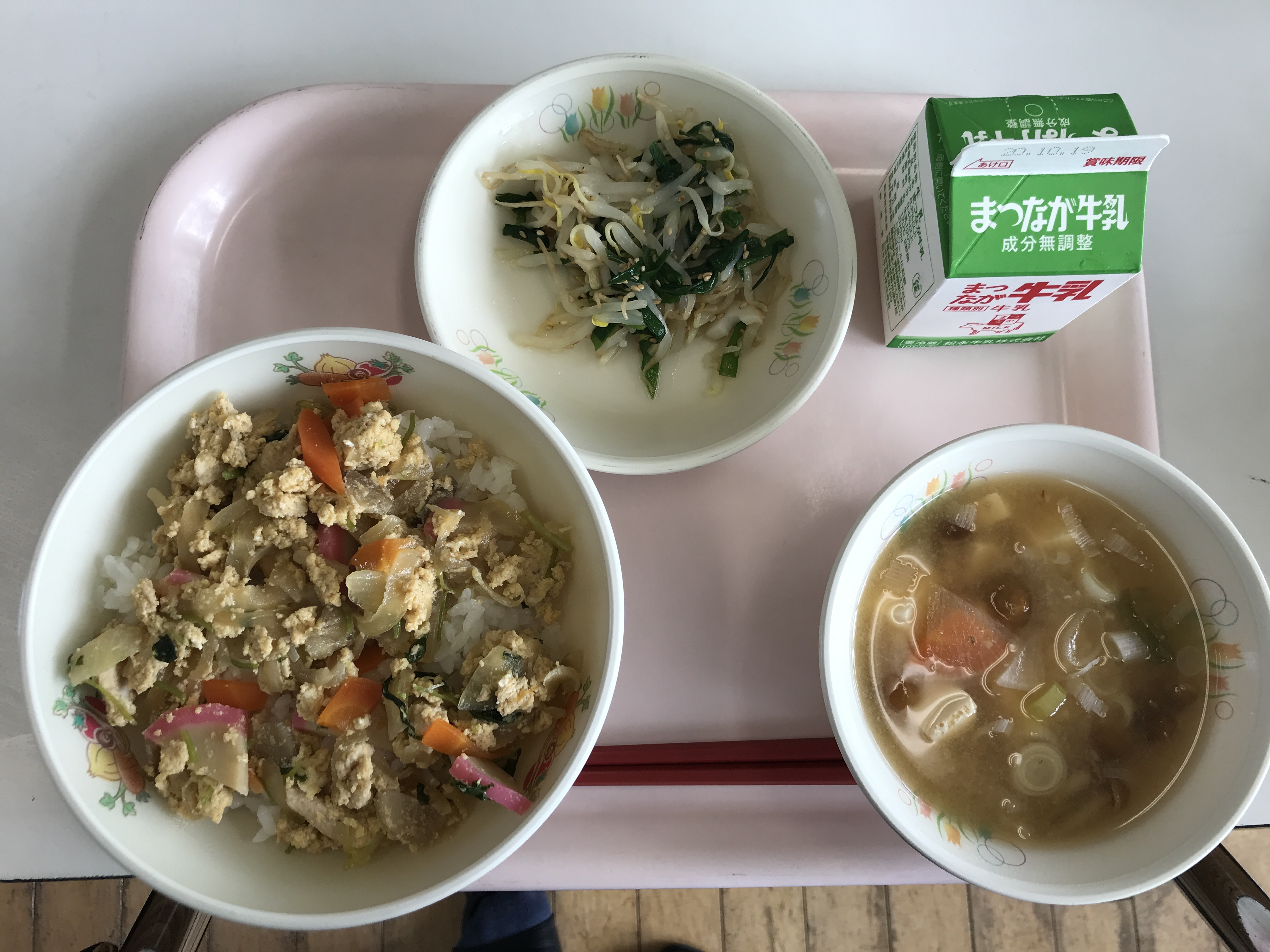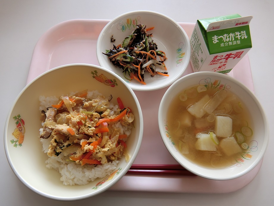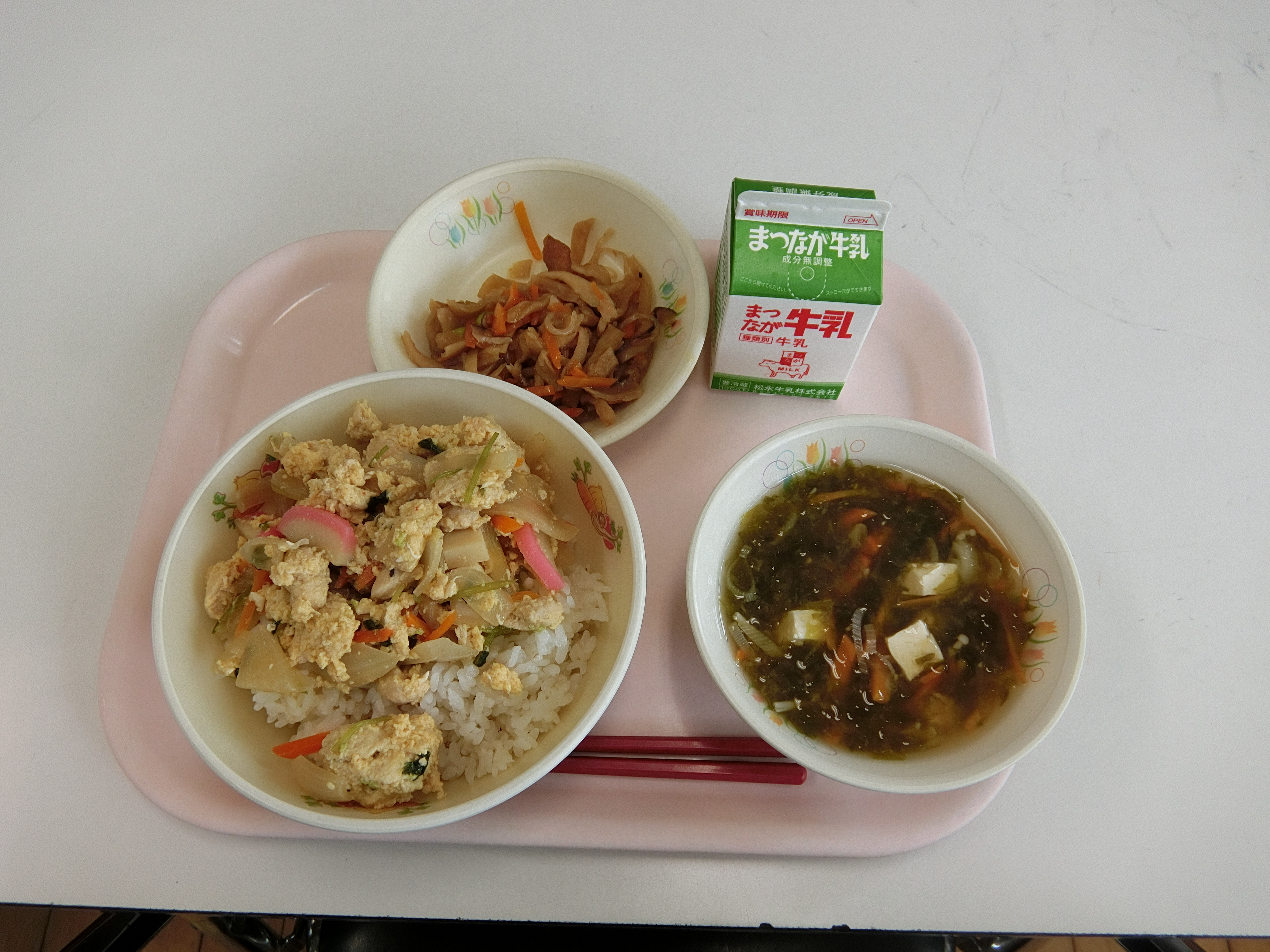3月8日親子丼、牛乳、ひじきのマリネ、根菜汁