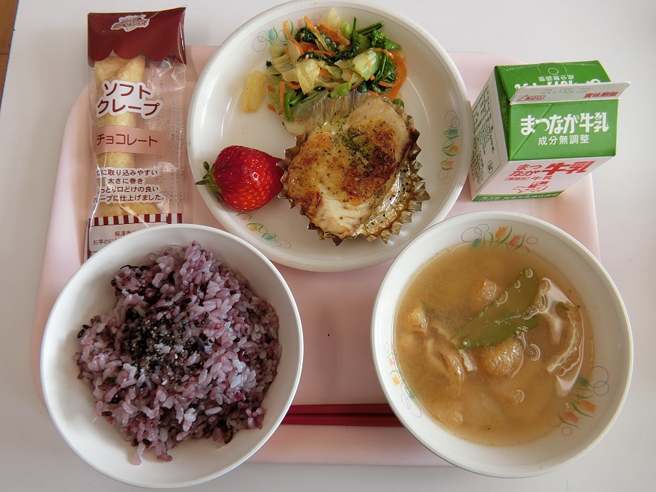3月16日 卒業を祝う献立。日本型食生活献立紫黒米(しこくまい)、牛乳、魚のさざれ焼き、菜の花和え、きぬさやのみそ汁、クレープ、いちご