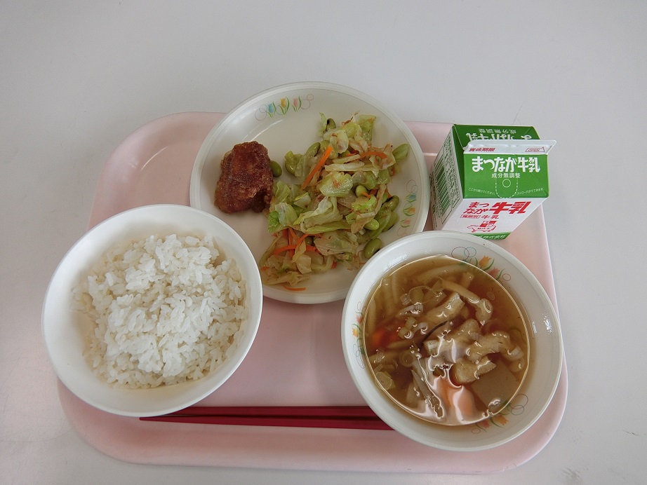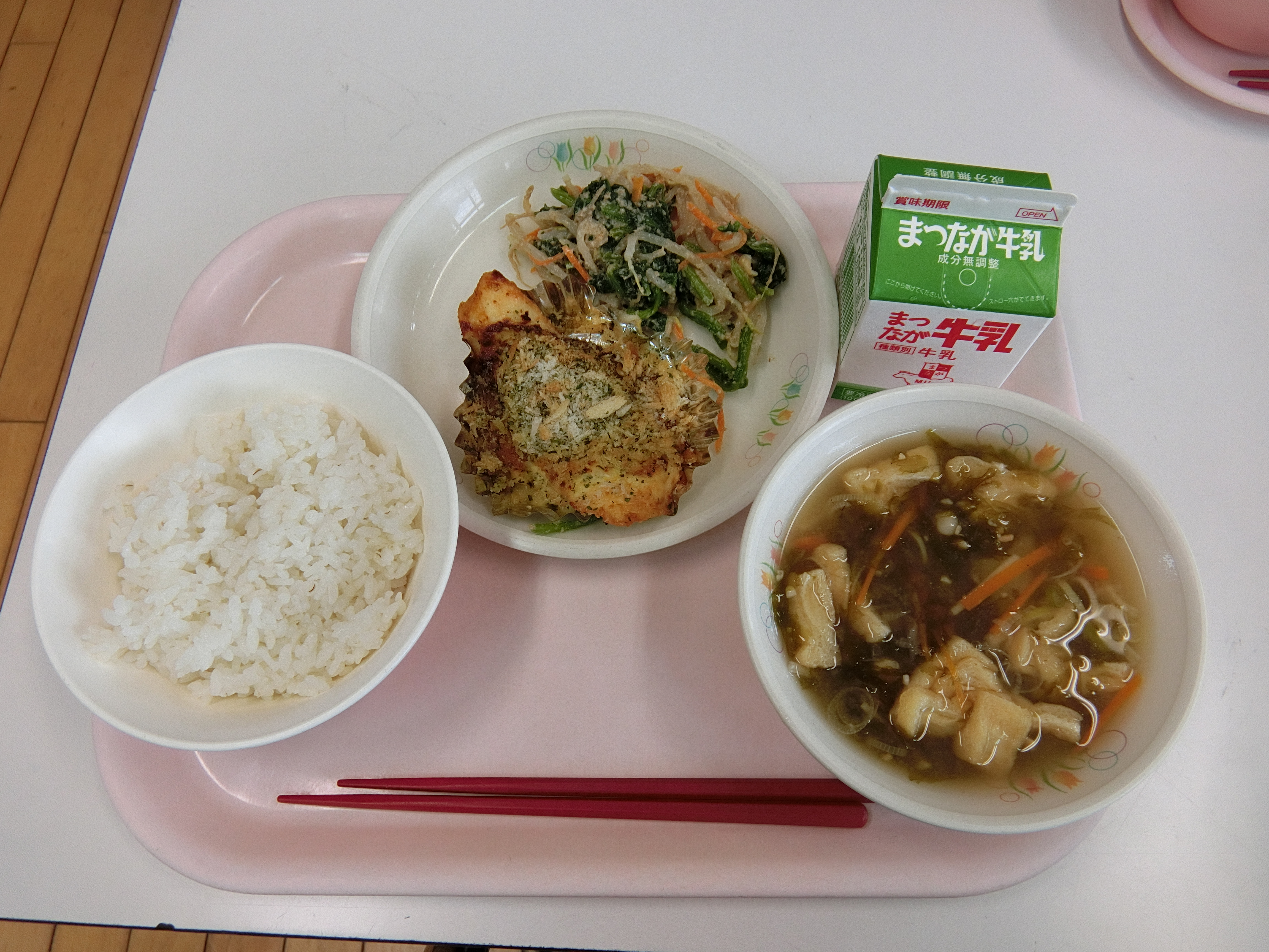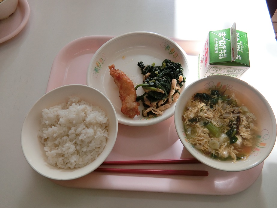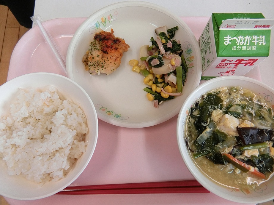 11月2日麦ごはん、牛乳、中華卵スープ、鶏肉の米粉焼き、小松菜とエリンギのソテー