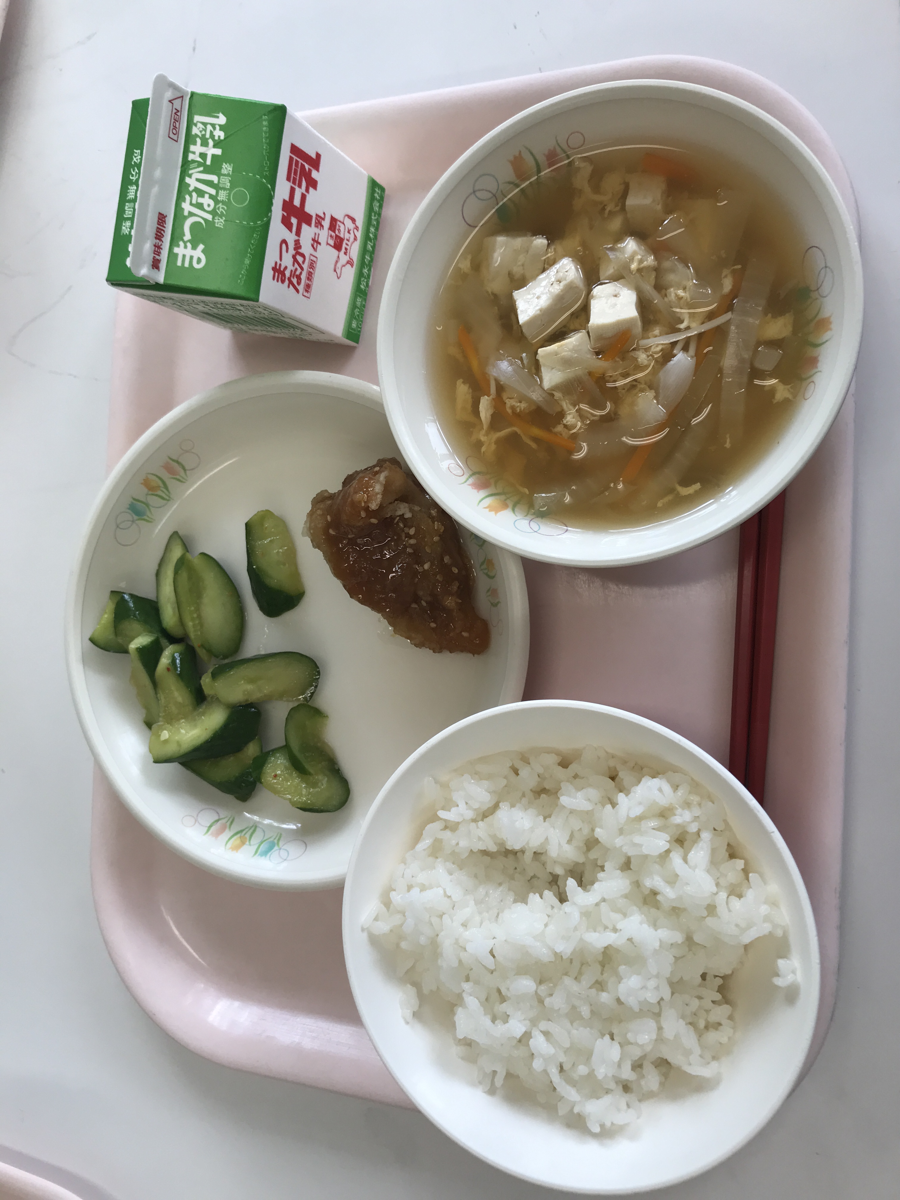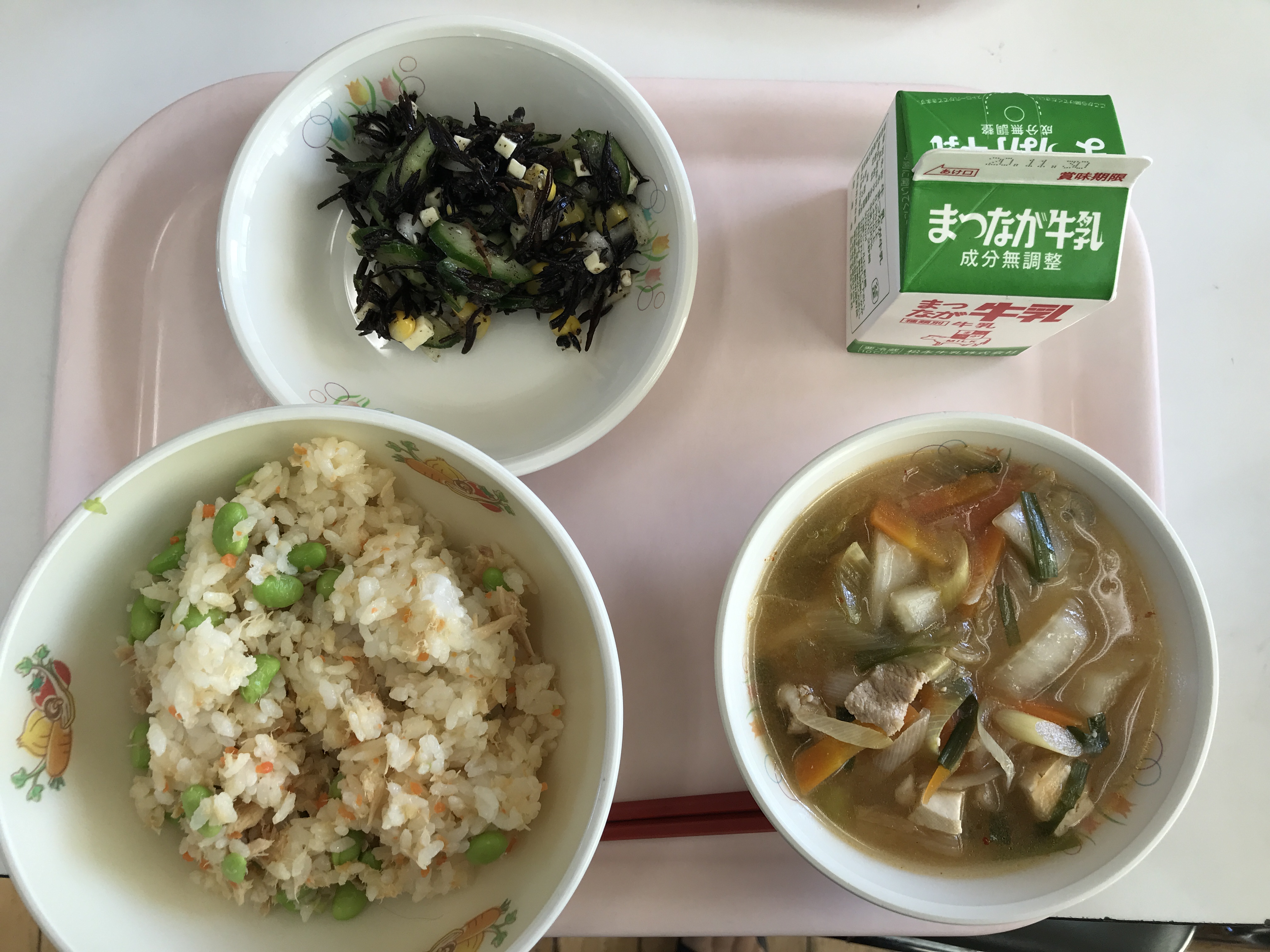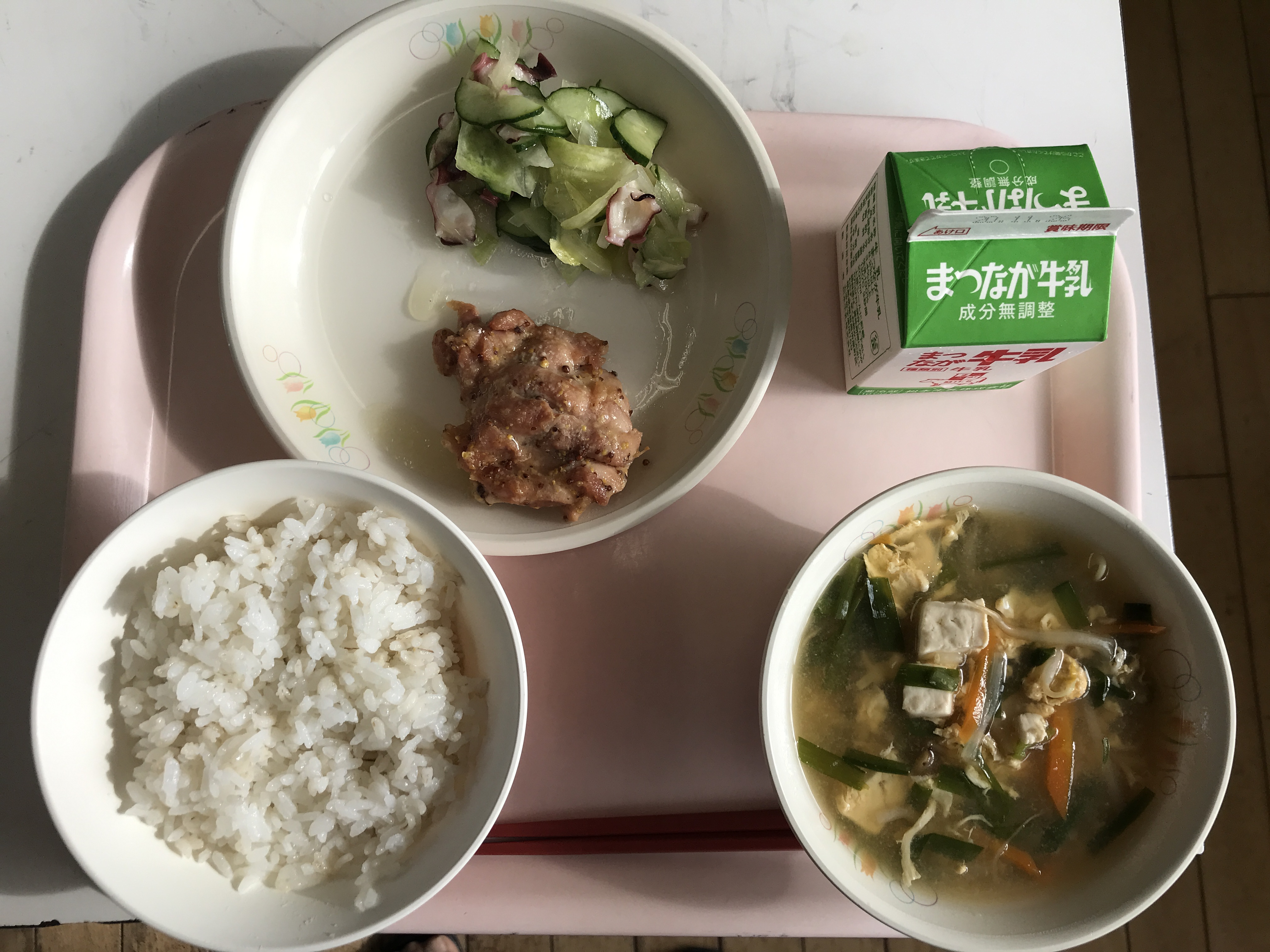 11月2日麦ごはん、牛乳、中華卵スープ、鶏肉の米粉焼き、小松菜とエリンギのソテー