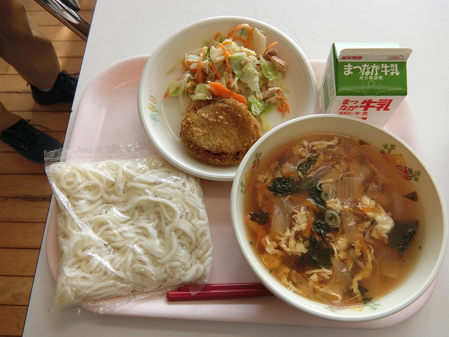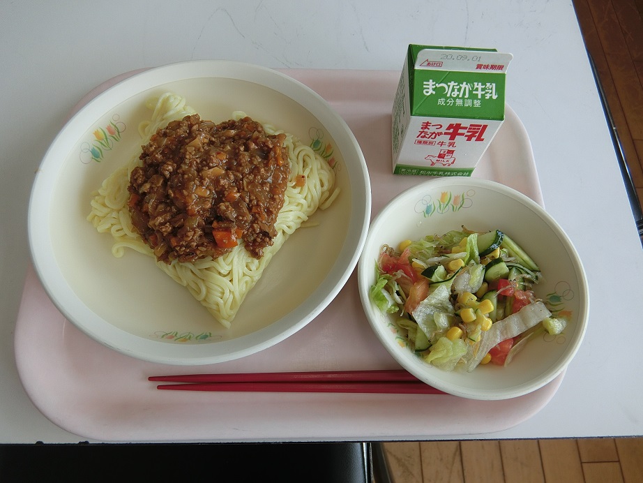 8月26日カルシウムアップ献立牛乳、ジャージャー麺、トマトとじゃこのサラダ