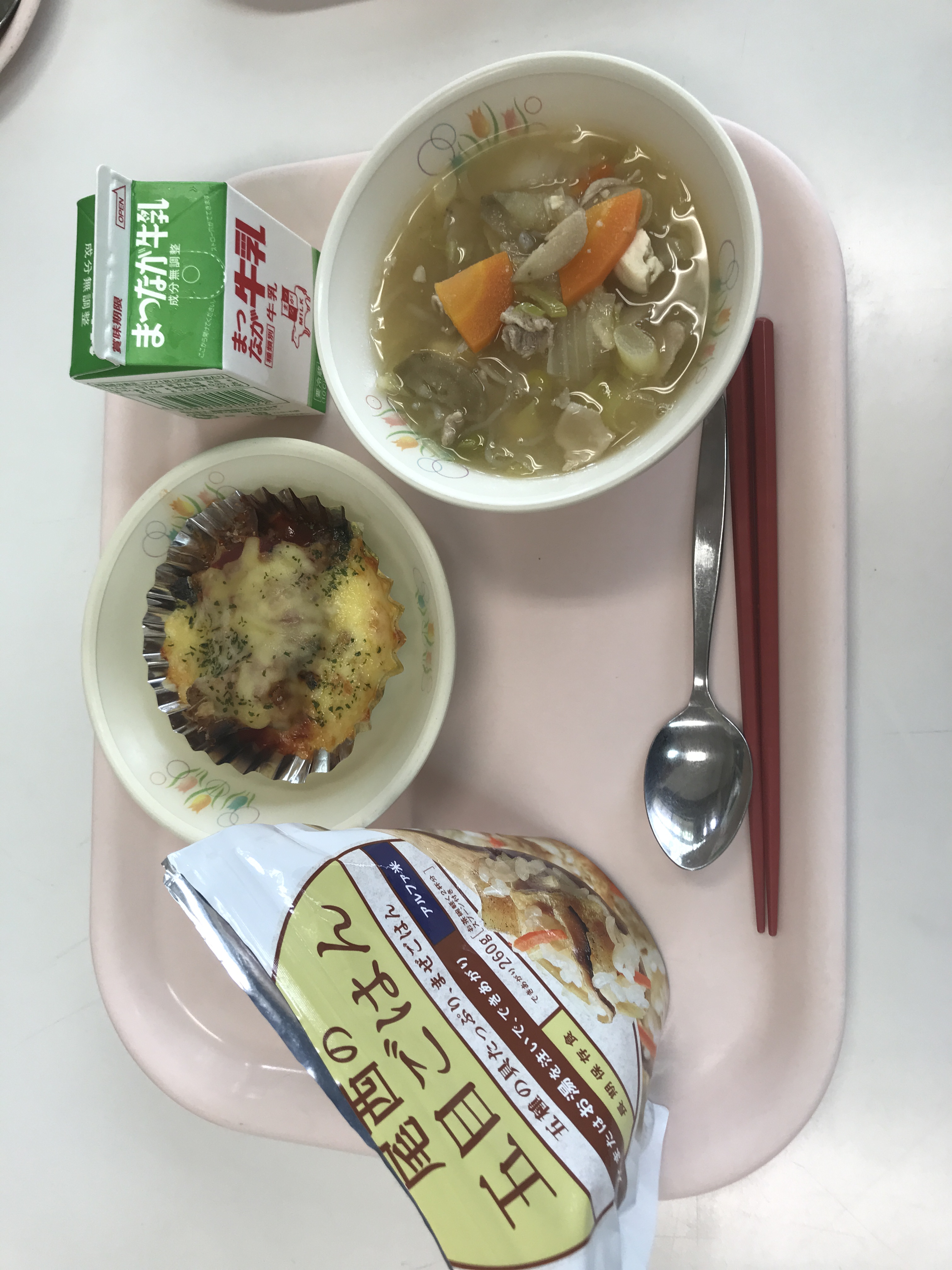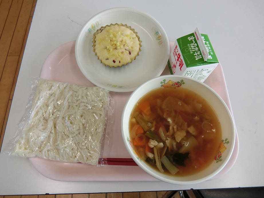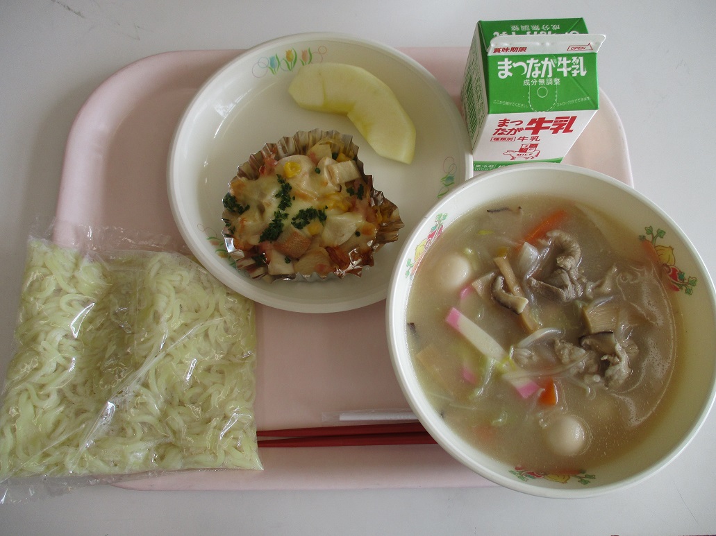 11月18日ちゃんぽん麺、牛乳、里芋のチーズ焼き、福島県産りんご