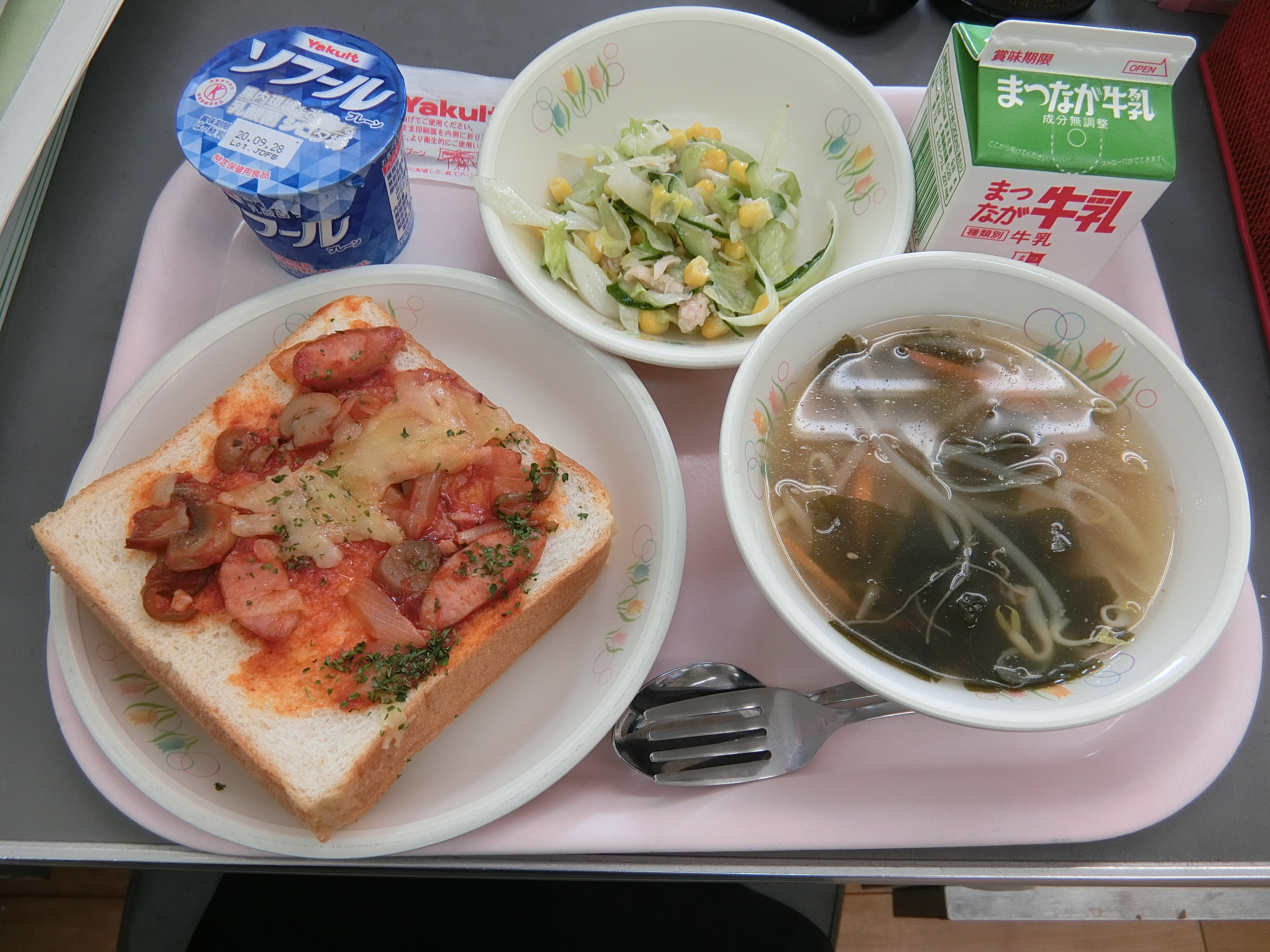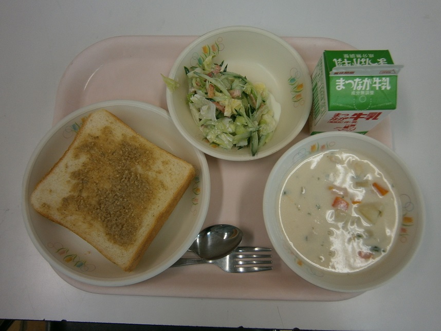 10月8日 鉄分アップ献立セサミトースト、牛乳、クラムチャウダー、シーザーサラダ
