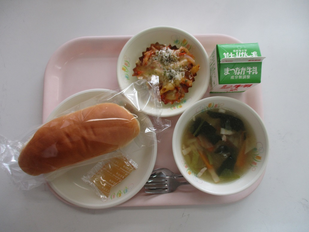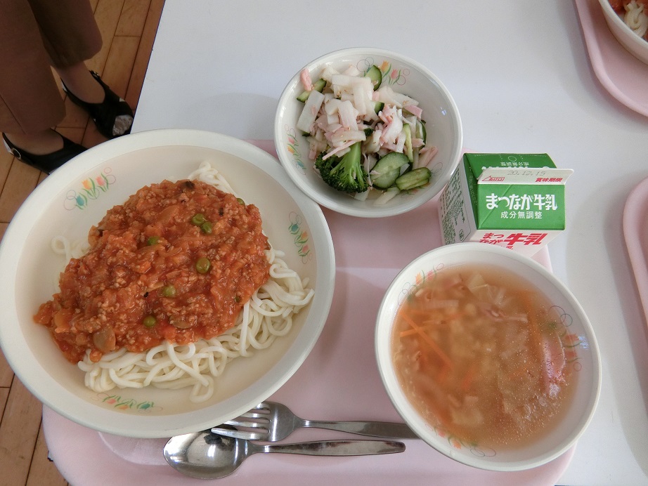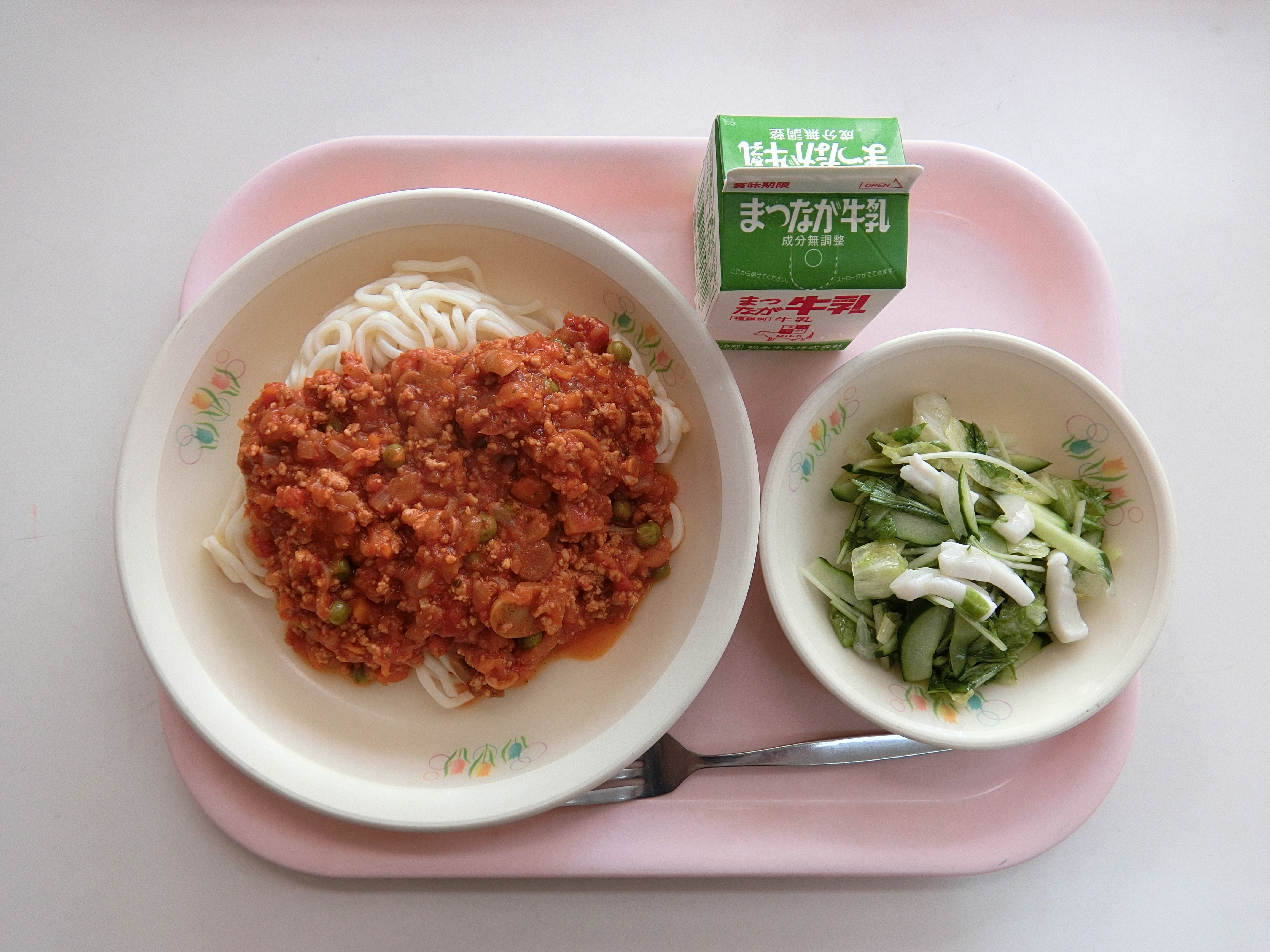 スパゲティミートソース、牛乳、アルファベットスープ、大根サラダ