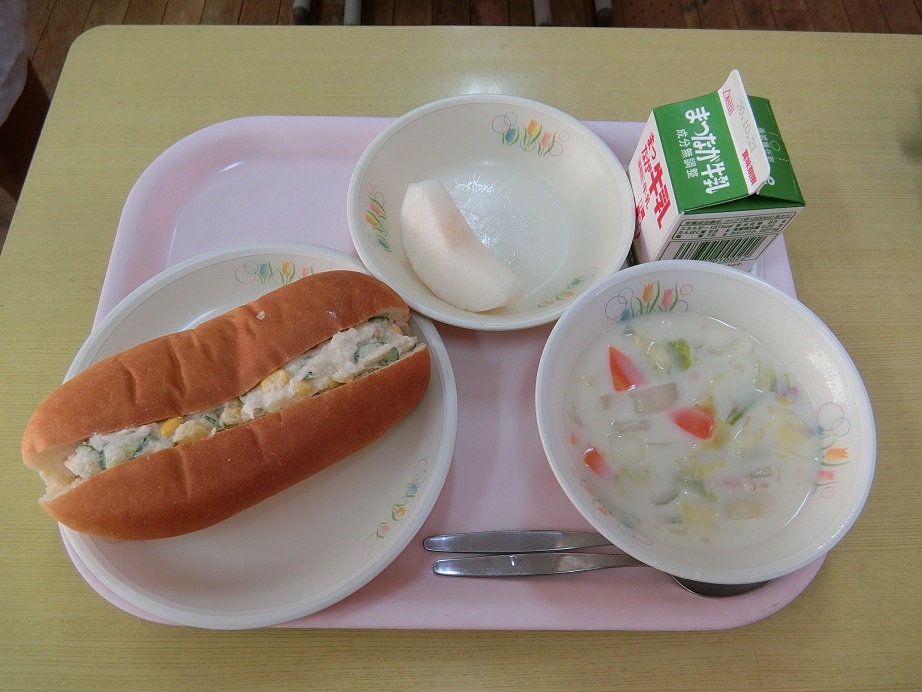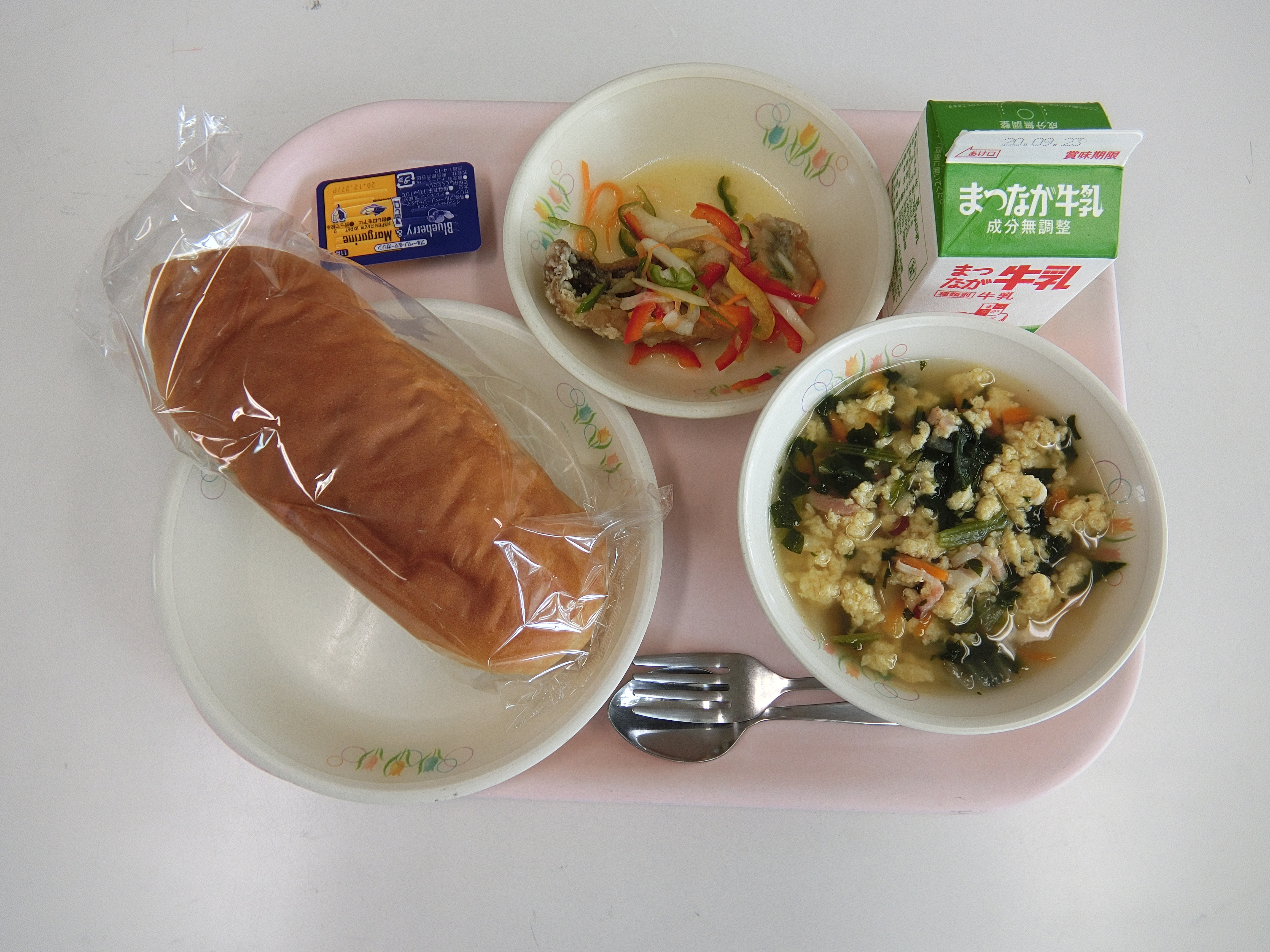 9月17日 そうま うまうま献立コッペパン、牛乳、ブルーベリージャム、鯵のマリネ、ふわふわ卵スープ