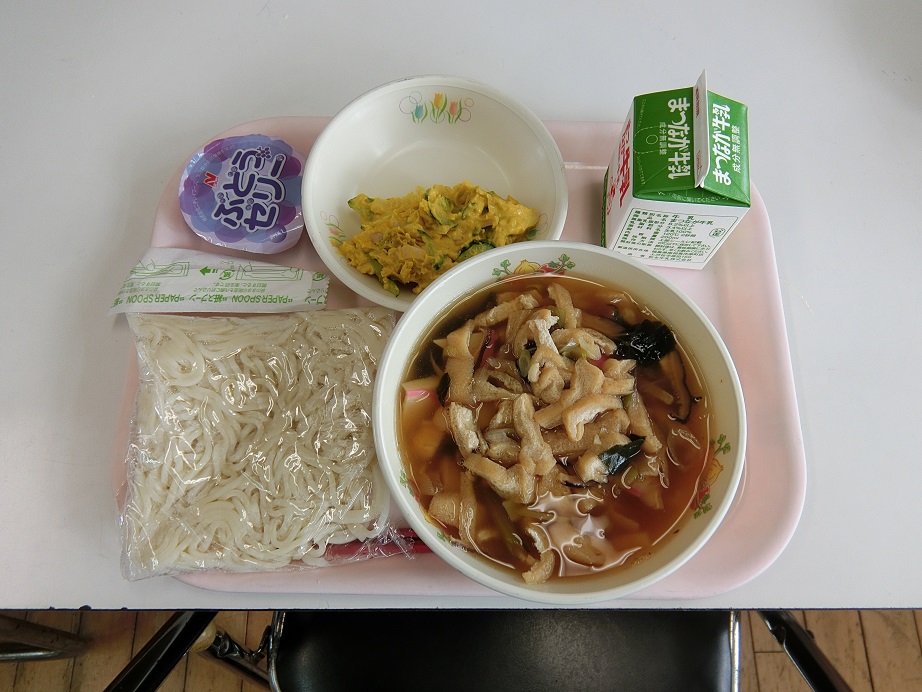 9月30日きつねうどん、牛乳、カボチャのサラダ、ぶどうゼリー