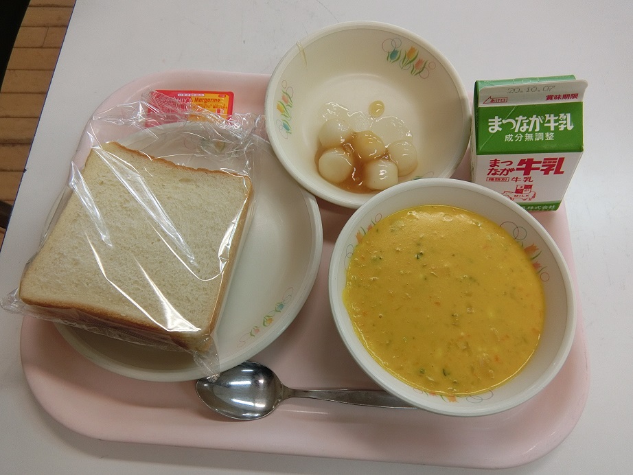 9月24日コッペパン、ジャーマンポテト、県産桃ジャム、豆腐団子スープ、牛乳