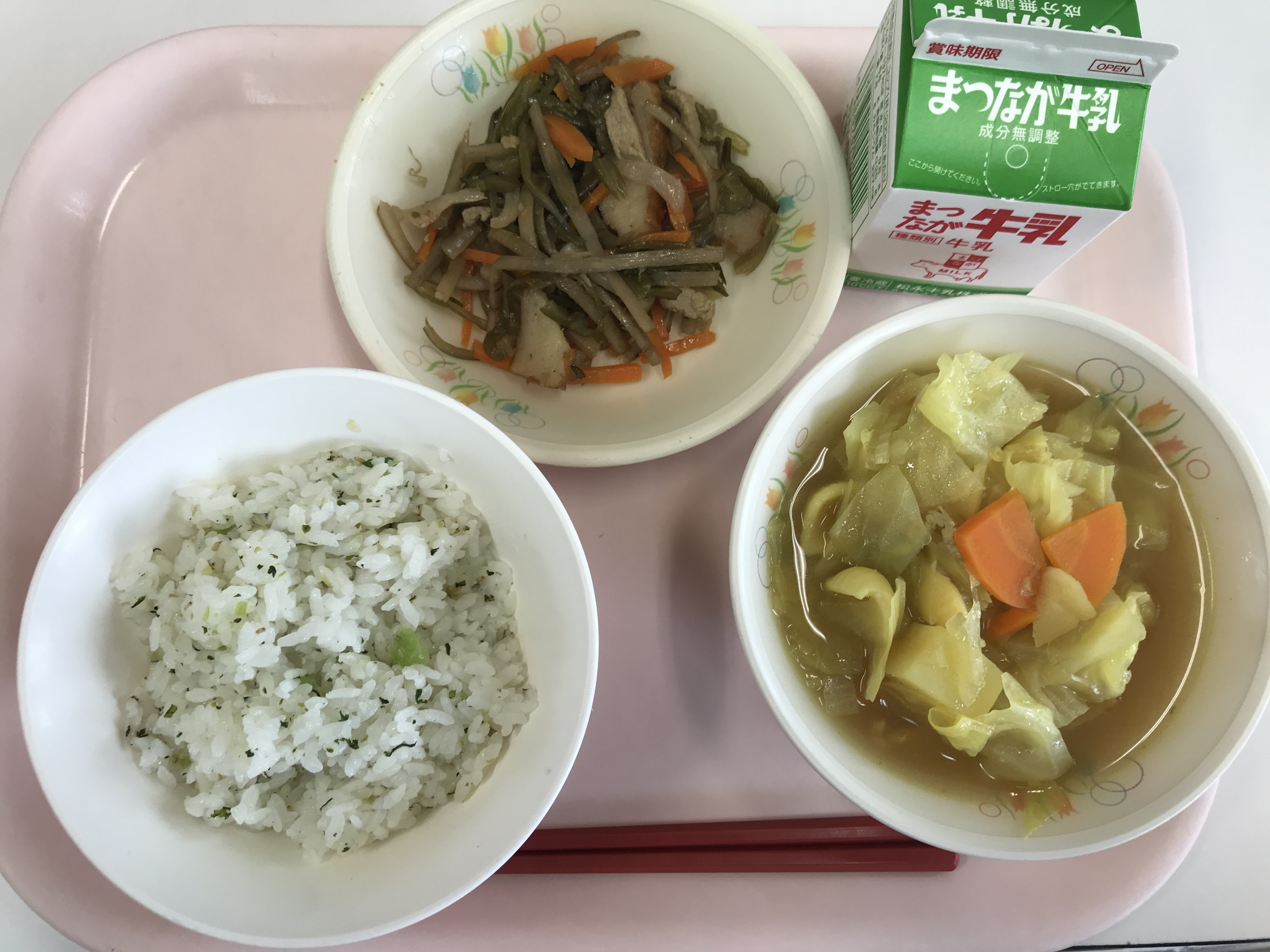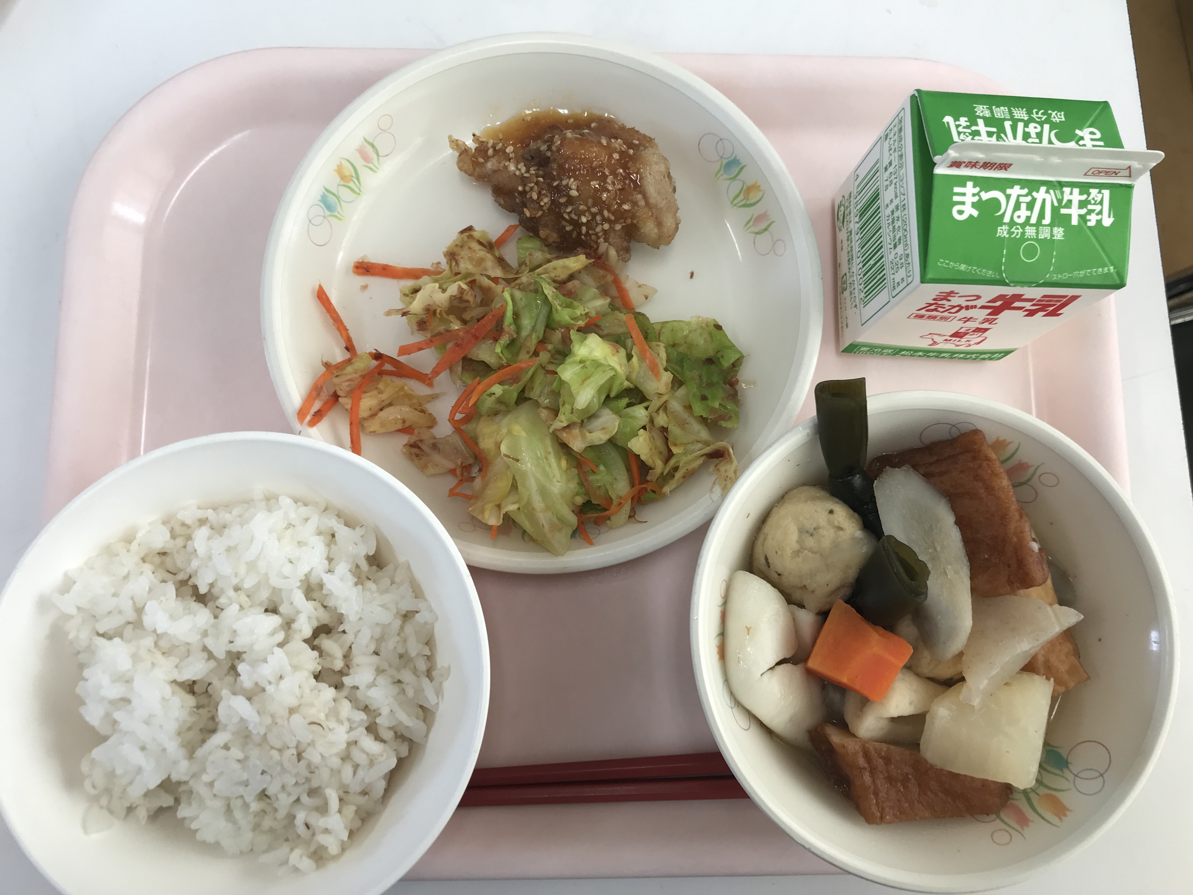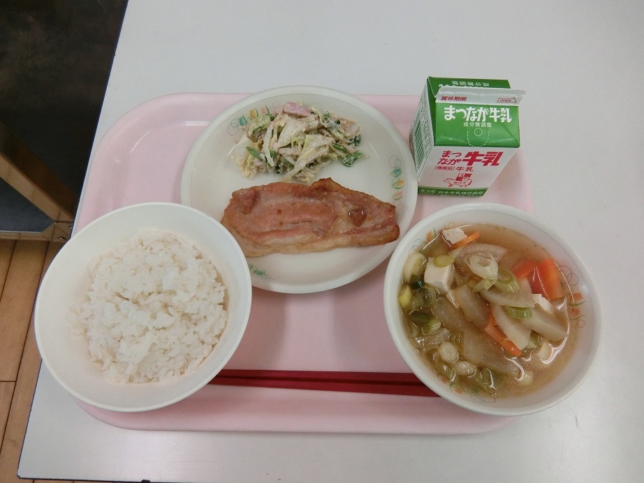 麦ごはん、牛乳、豚肉の生姜焼き、ごまネーズ和え、けんちん汁(醤油仕立て)