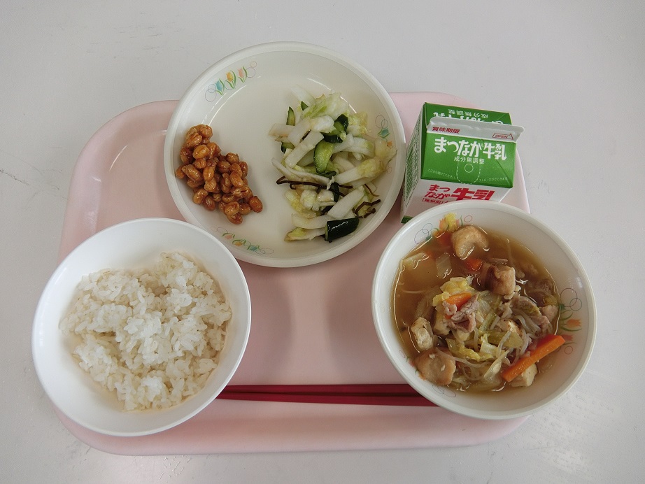 1月13日 鉄分アップ献立五目タンメン、牛乳、鉄っ子サラダ