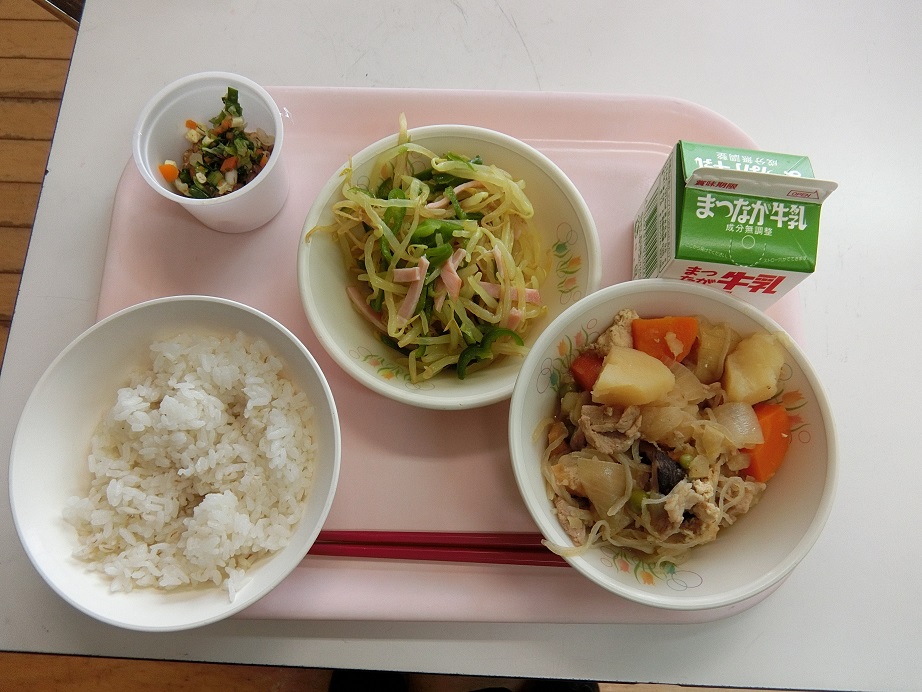 2月5日麦ごはん、牛乳、すき焼き煮、スイートポテトサラダ