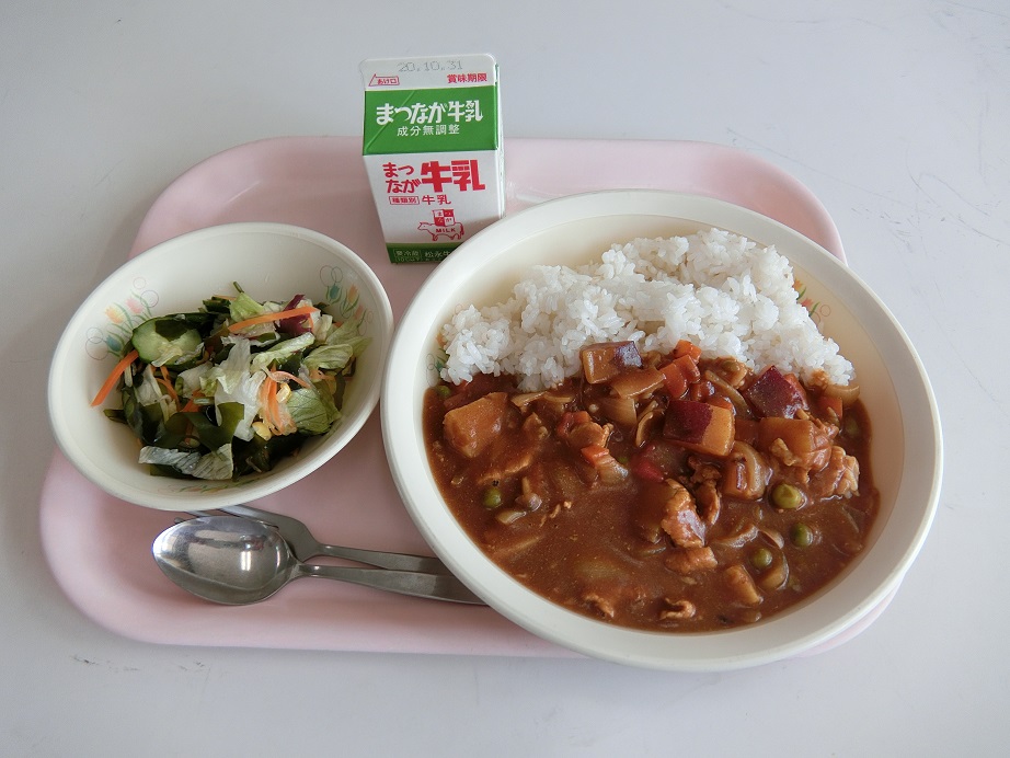 1月29日 県産水産物学校給食提供事業(ほっき 相馬産)そうま うまうま献立ほっきカレー(相馬産ほっき貝)、牛乳、ポパイサラダ