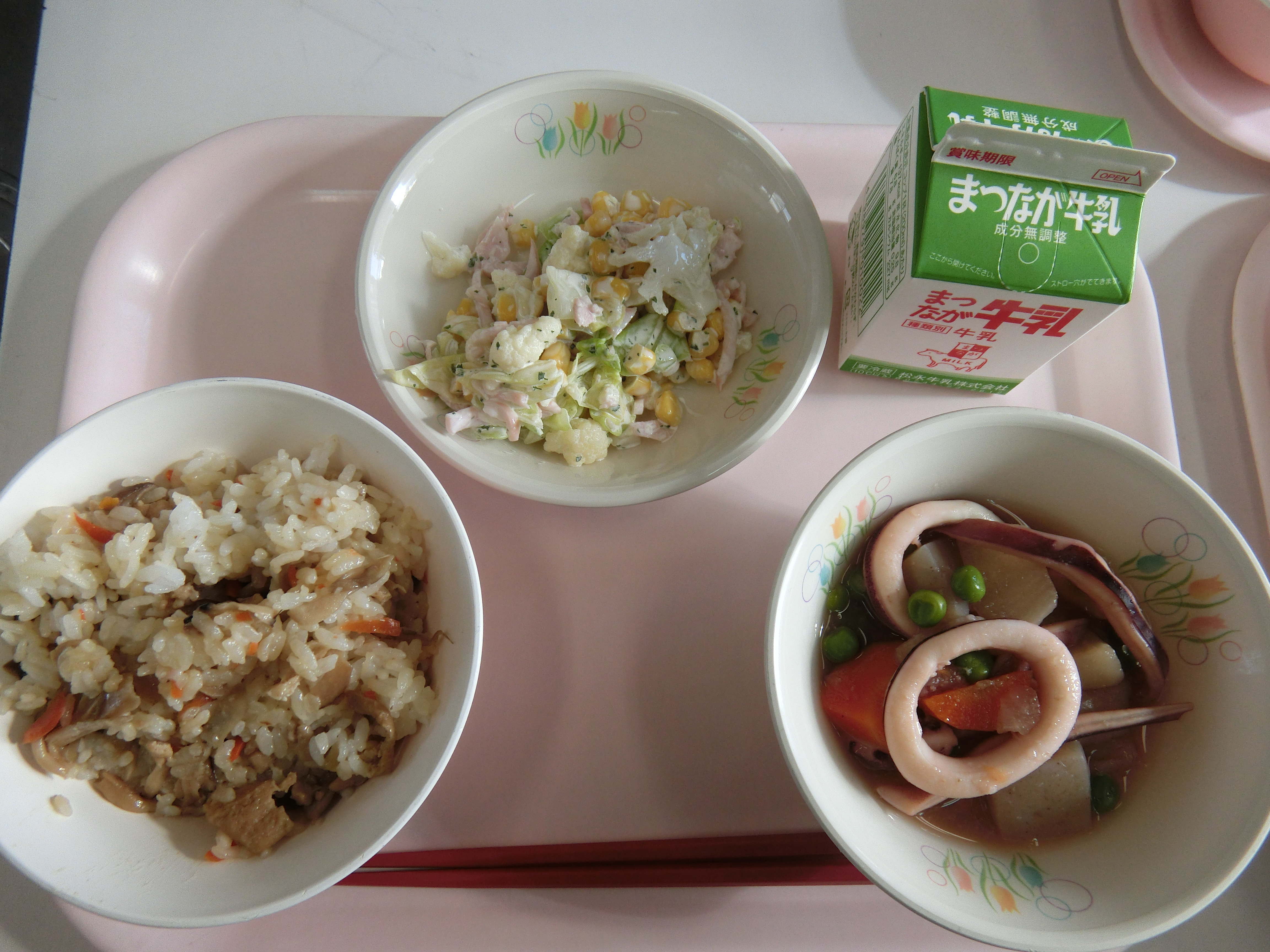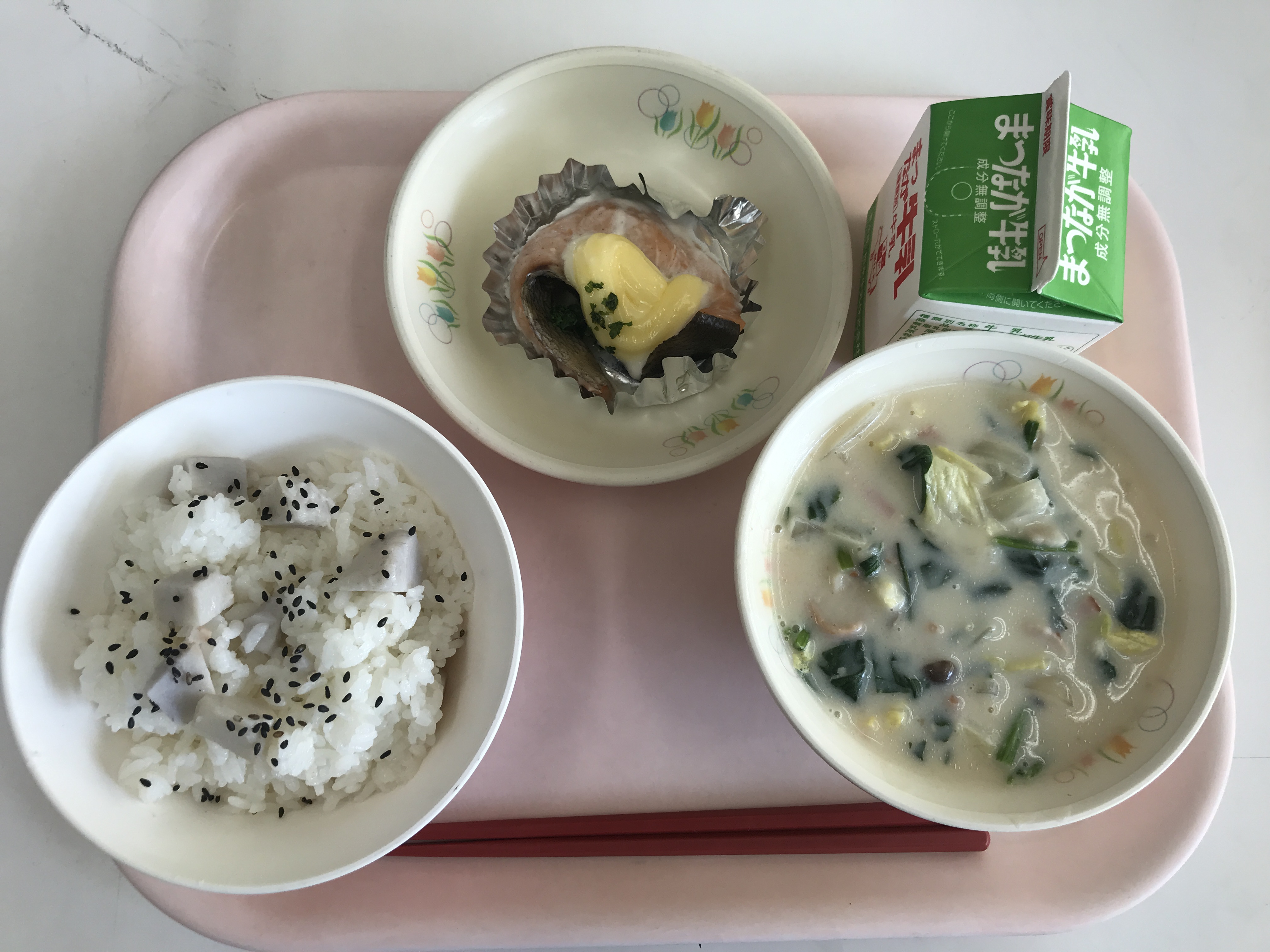 10月2日 カルシウムアップ献立麦ごはん、牛乳、もずくスープ、いわしのかば焼き、小松菜サラダ