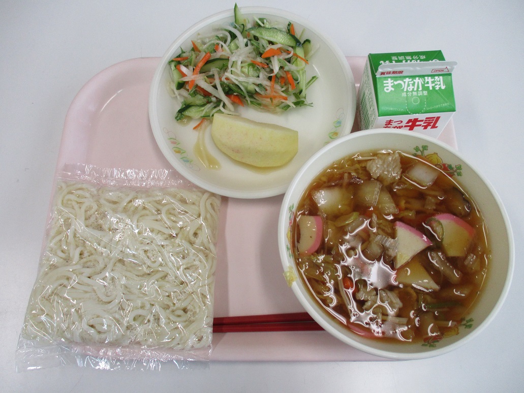 11月11日すきやきうどん、牛乳、大根サラダ、りんご