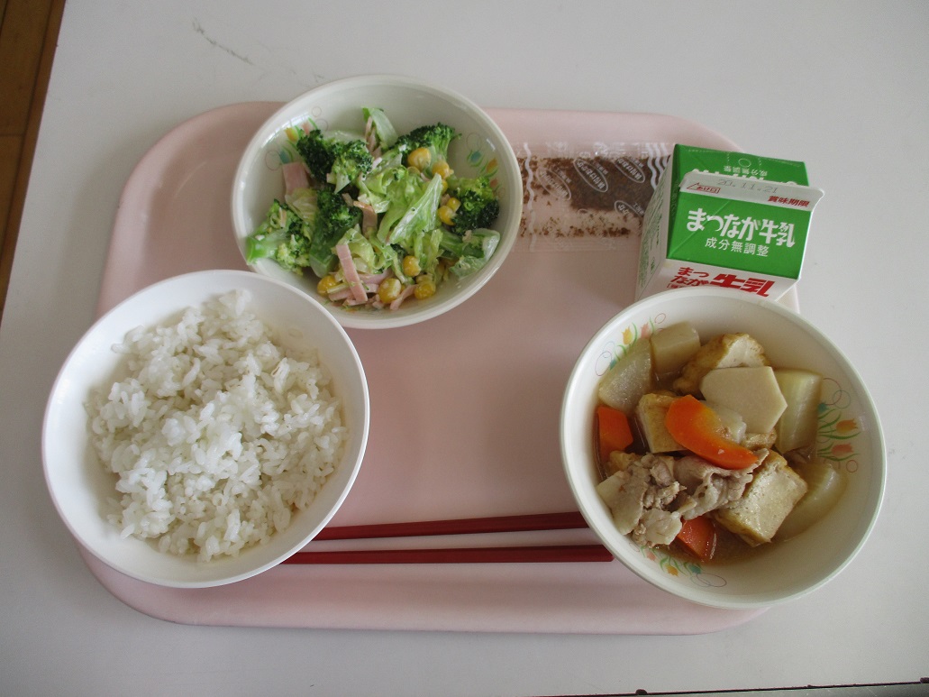 麦ごはん、牛乳、豚肉と大根の煮物(相馬土垂が入っています)、ブロッコリーのマヨネーズ和え