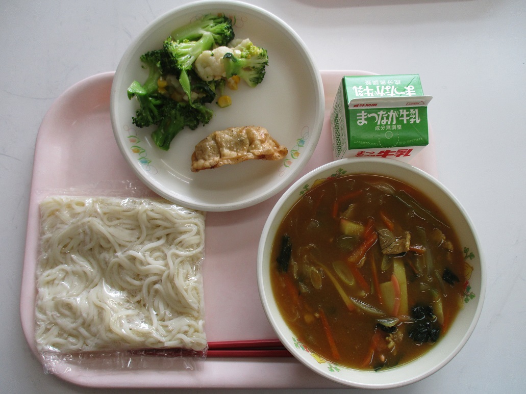 11月25日 4年生のリクエスト献立カレーうどん、牛乳、揚げ餃子、花野菜サラダ