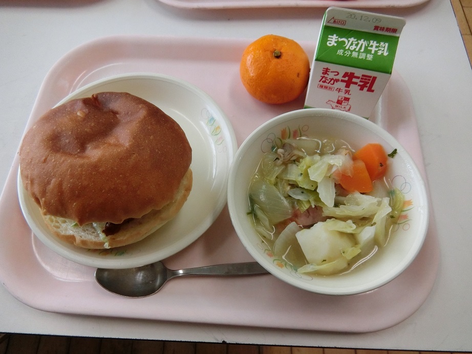 12月3日タンドリーチキンサンドパン、牛乳、ポトフ、みかん