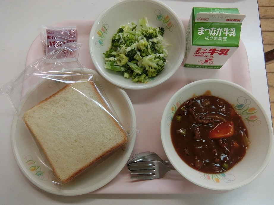 食パン、牛乳、いちごジャム、ビーフシチュー、ブロッコリー和え