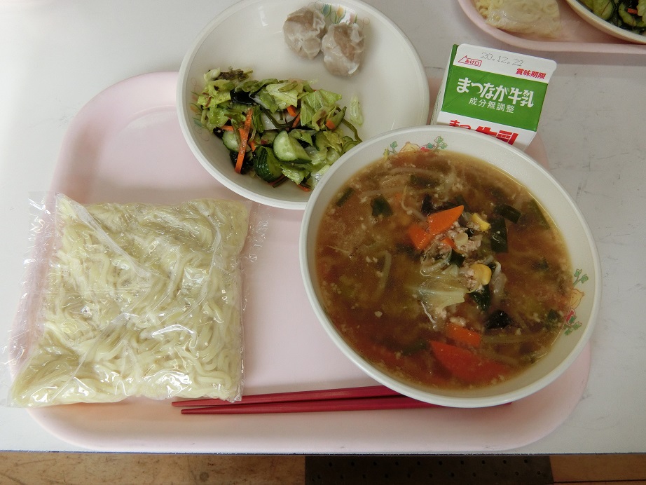 12月16日 3年生リクエスト給食味噌ラーメン、牛乳、シューマイ、チョギレサラダ