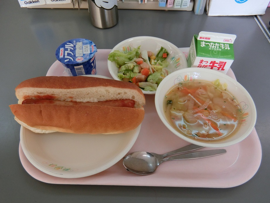 12月17日 カルシウムアップ献立ドックパン、牛乳、ビーンズサラダ、オニオンスープ、ソフール