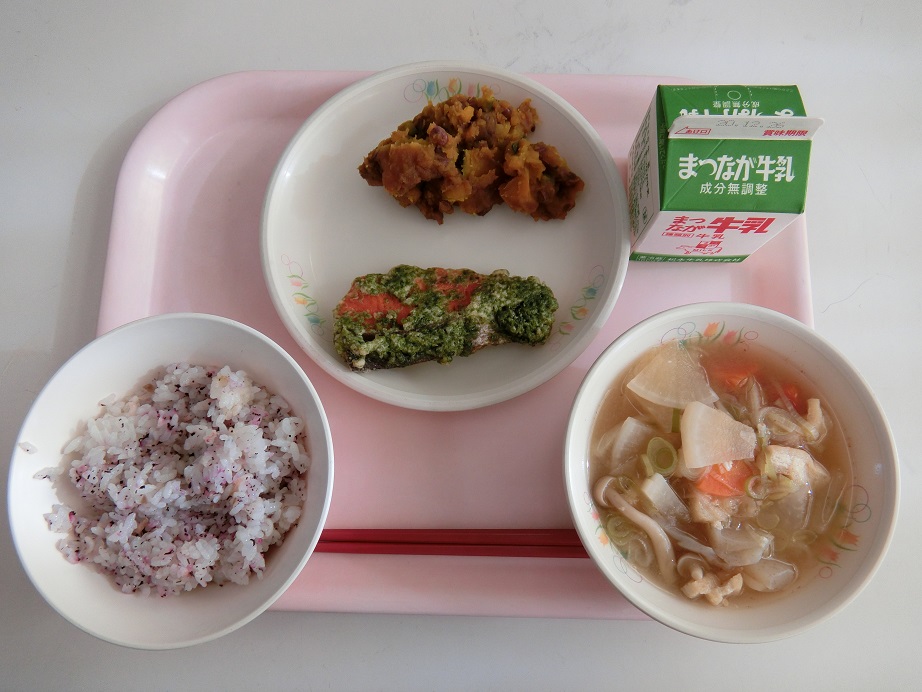 12月21日(月) 冬至の日献立ゆかりごはん、牛乳、紅鮭の磯部揚げ、冬至かぼちゃ、根菜汁