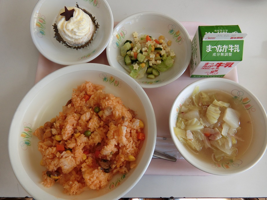 12月22日(火)クリスマス献立チキンライス、牛乳、野菜スープ、チーズサラダ、ケーキ今年最後の給食です。調理員さん、今年一年、ありがとうございました。そして、来年もよろしくお願いします。